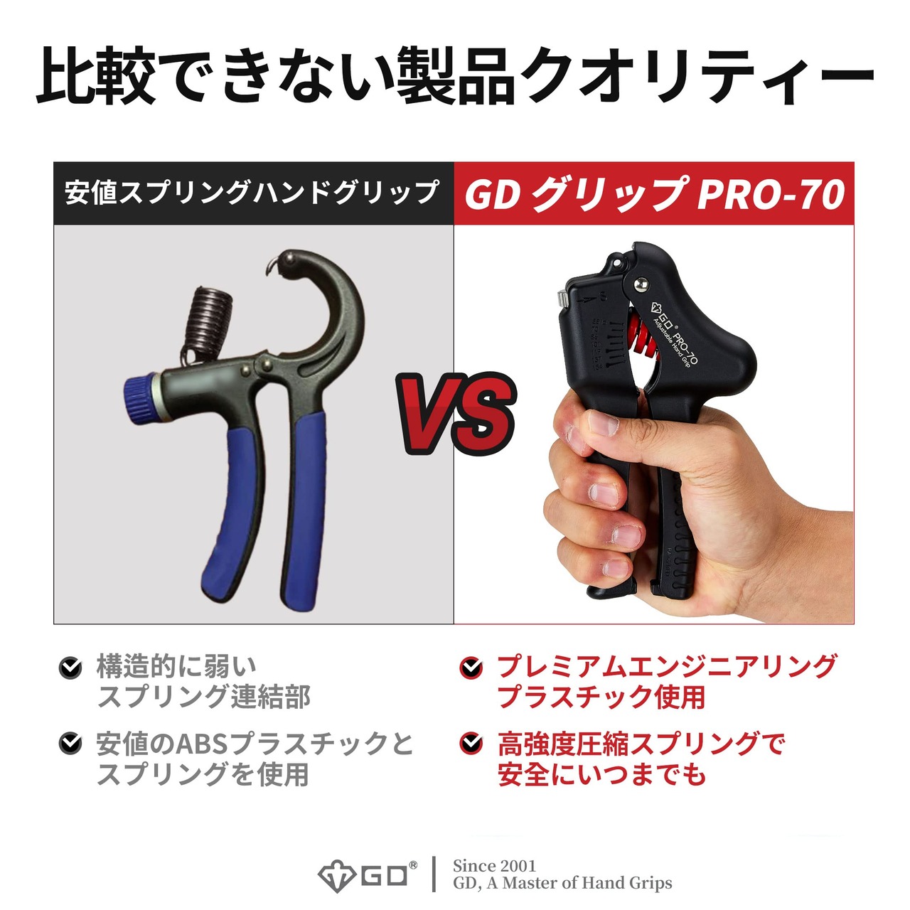 [一台のハンドグリップでウォーミングアップからネガティブトレーニングまで可能です] あまたあるハンドグリップを求めて散財する必要はもうありません。GD GRIP PRO-70が一台あれば、25~70kgレンジのハンドグリップすべてを手にしたも同然なのです。強度小のウォーミングアップから強度大のネガティブトレーニングまで、一台のハンドグリップで体系的なトレーニングができます。ご自身の力量に合わせて着実にトレーニングでき、握力も迅速に増大します。