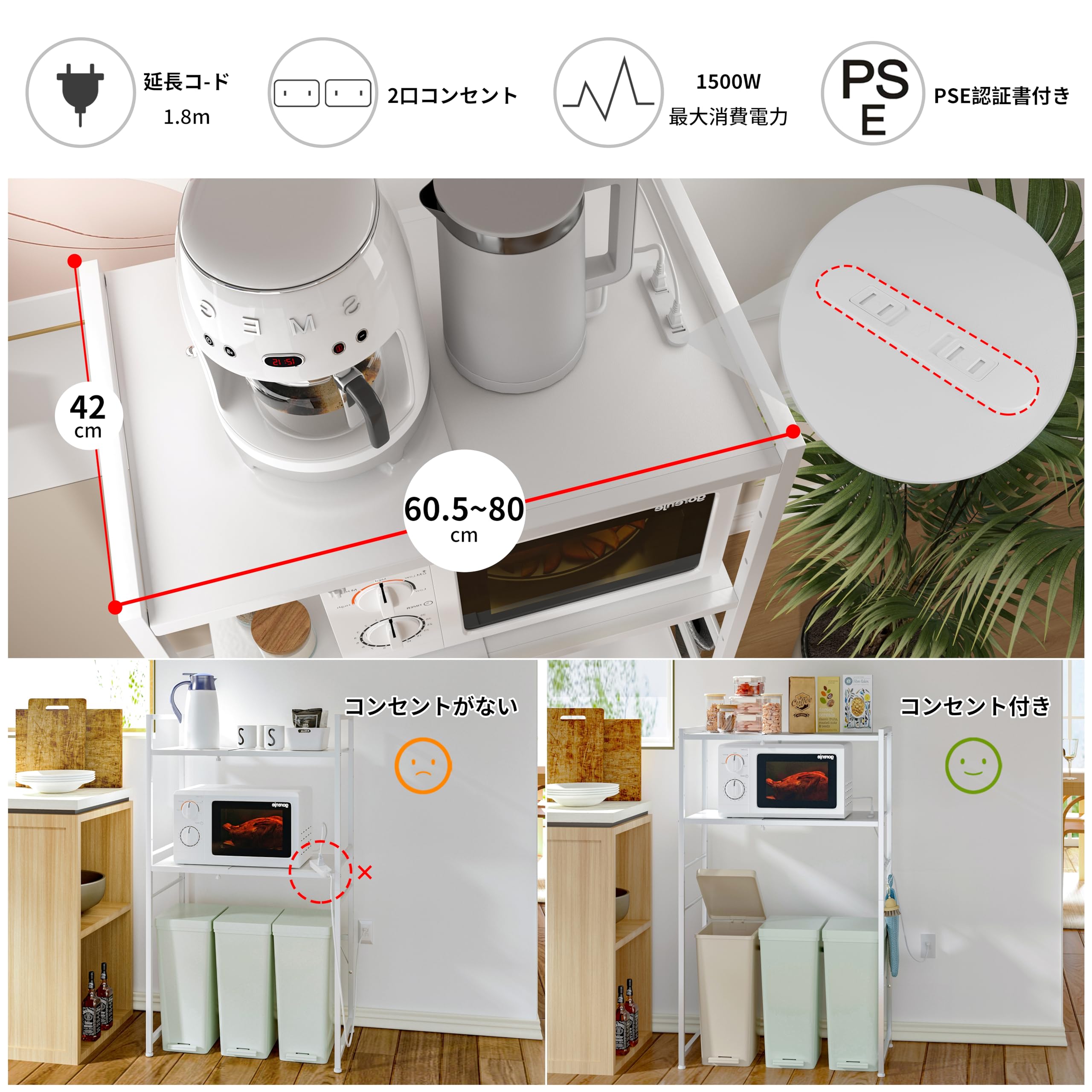 【オペレーション機能】2口コンセント付き、レンジ台やプリント台を置くときに便利です。そして幅が60.5から80までサイズを調整できるため、様々な空間で使用しやすくなっています。