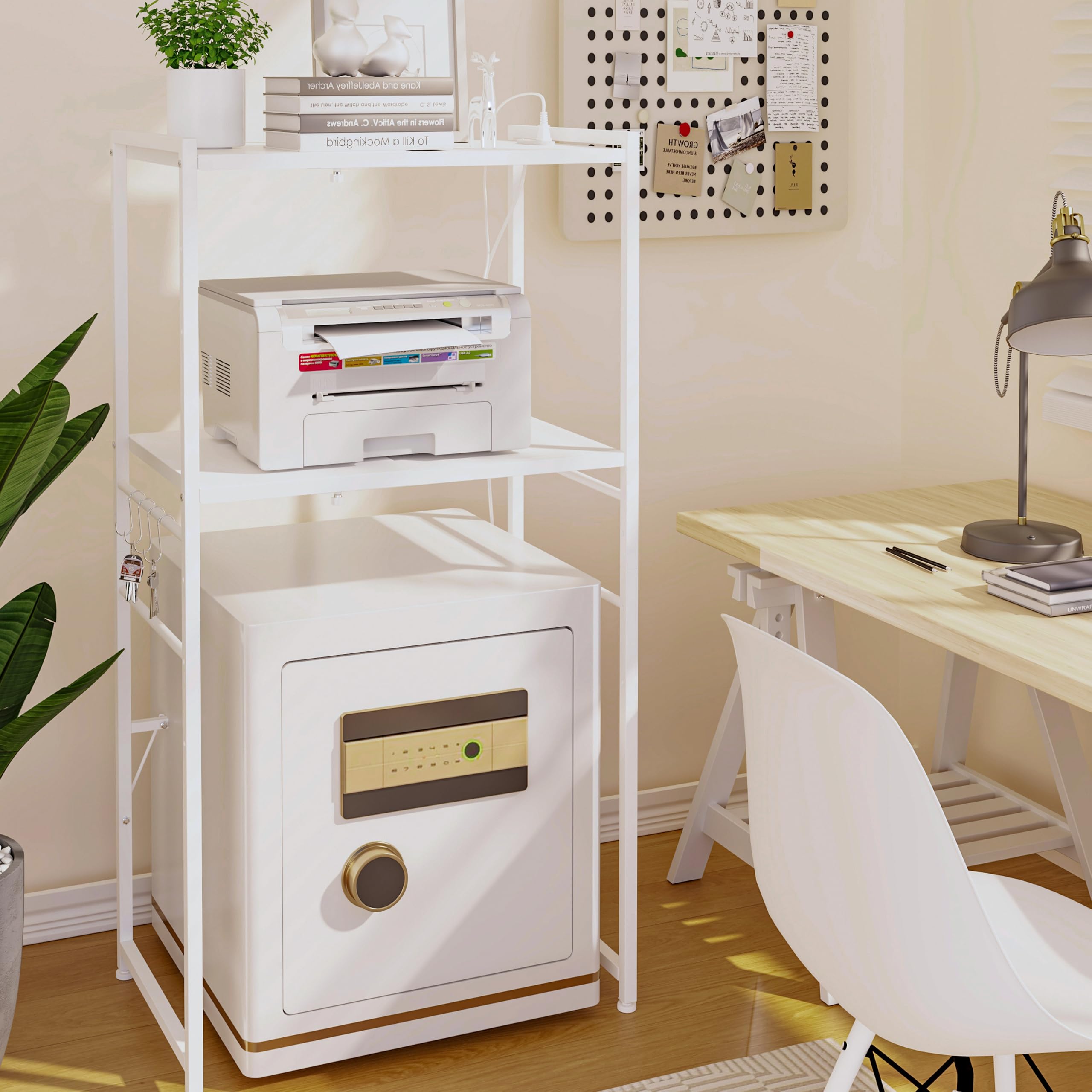 【多機能収納ラック】棚板は収納する物に合わせて高さを調整可能です。約11㎝ぐらいの8段階可動棚で、下部のスペースにはゴミ箱、冷蔵庫、洗濯機などを収納できます。棚板の上部にはレンジ台やプリント台などを置くことができます。