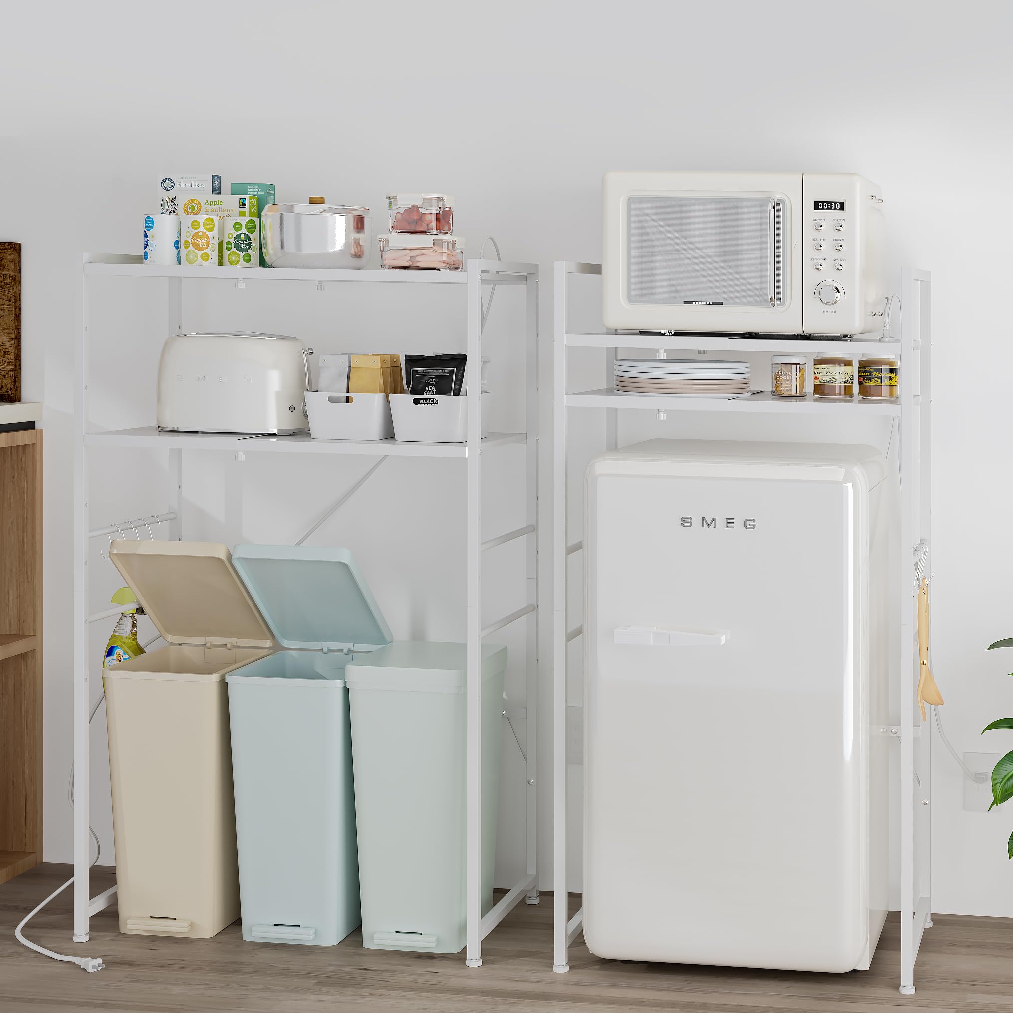 LunarLight ゴミ箱上ラック 幅60.5から-80まで*奥行42*高さ129.5cm 多機能横幅伸縮できる コンセント付きキッチンベイカーラック キッチンラック レンジ台 オーペンラック ゴミ箱収納 プリント台ラック 可動式棚板多段調整 Sフック付き 荷重70kg 錆び防止 耐摩擦性 耐水性 耐熱性機能 (ホワイト)