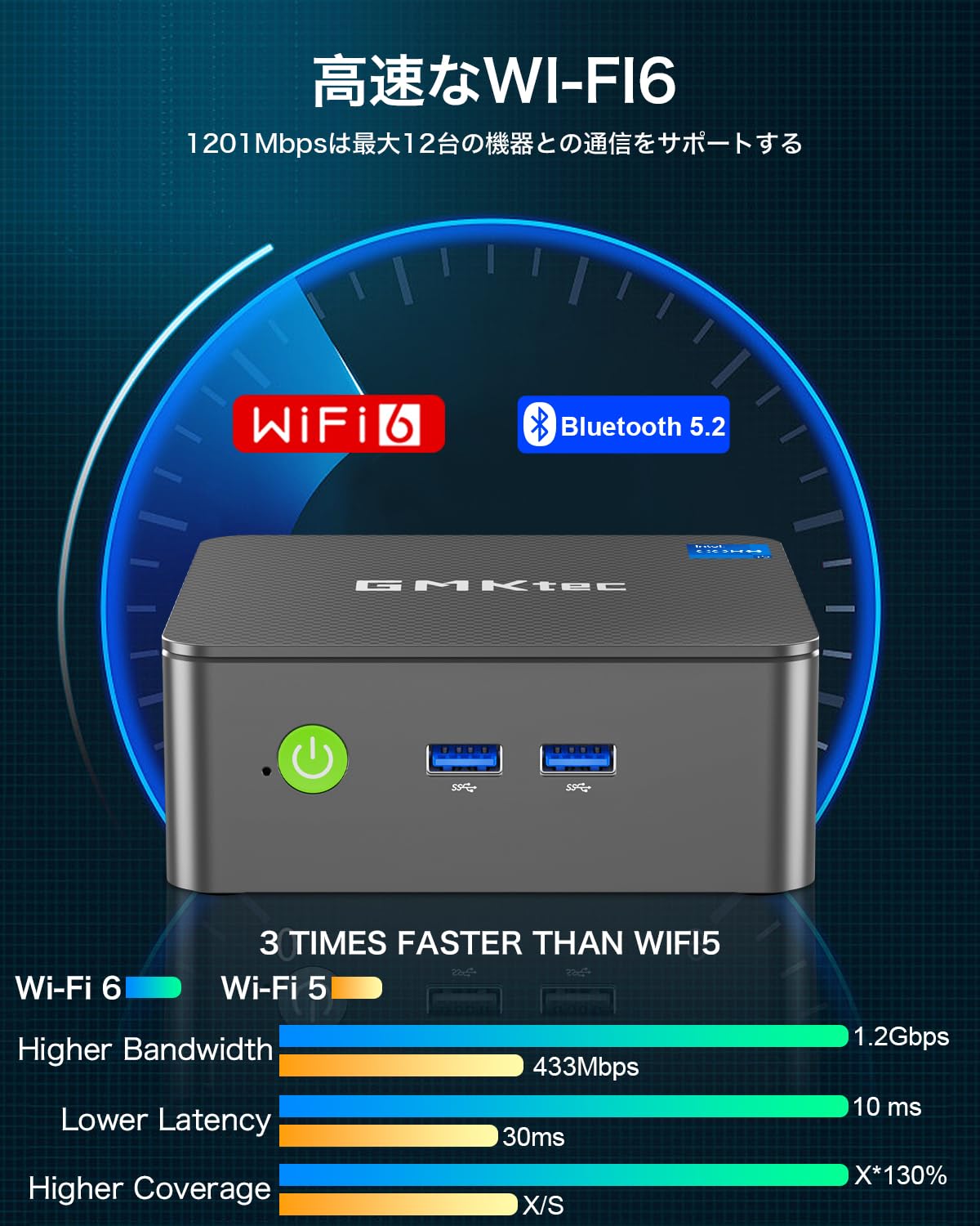 【デュアルバンドWi-Fi 6|ビジネス・商業用途】GMKtec ミニPCは安定したWi-Fi 6(最大1.2Gbps)を搭載し、高速なデータ送受信でスムーズなネットサーフィンを実現します。最新無線通信規格802.11axに対応し、最大600Mbpsの高速通信を実現。データの送受信が高速で、迅速なダウンロード、待ち時間がより短縮しスムーズなネットサーフィンを楽しめます。GMKtec ミニpcはBluetooth 5.2にも対応します。小型パソコンは、Wake On LAN、PXEブート、RTCウェイク、自動電源オン(BIOSインターフェイス設定に入る)をサポートしています。
