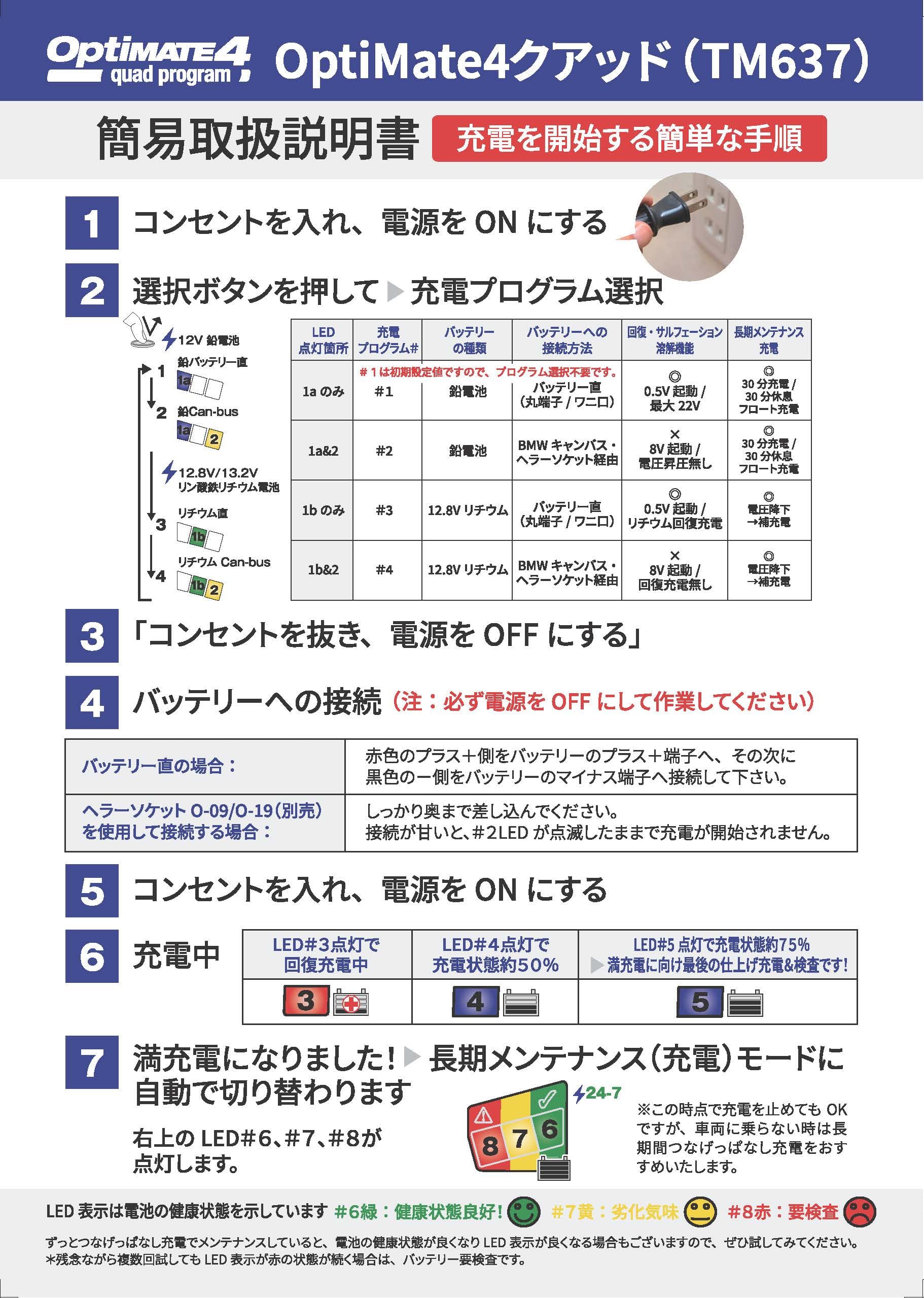 注)完全に寿命を迎えた電池、内部ショートした電池等はオプティメイト充電器で復活する事は出来ませんので予めご了承ください。電池内部でショートが起きた場合は、どんな充電器を使用しても復活出来ません。