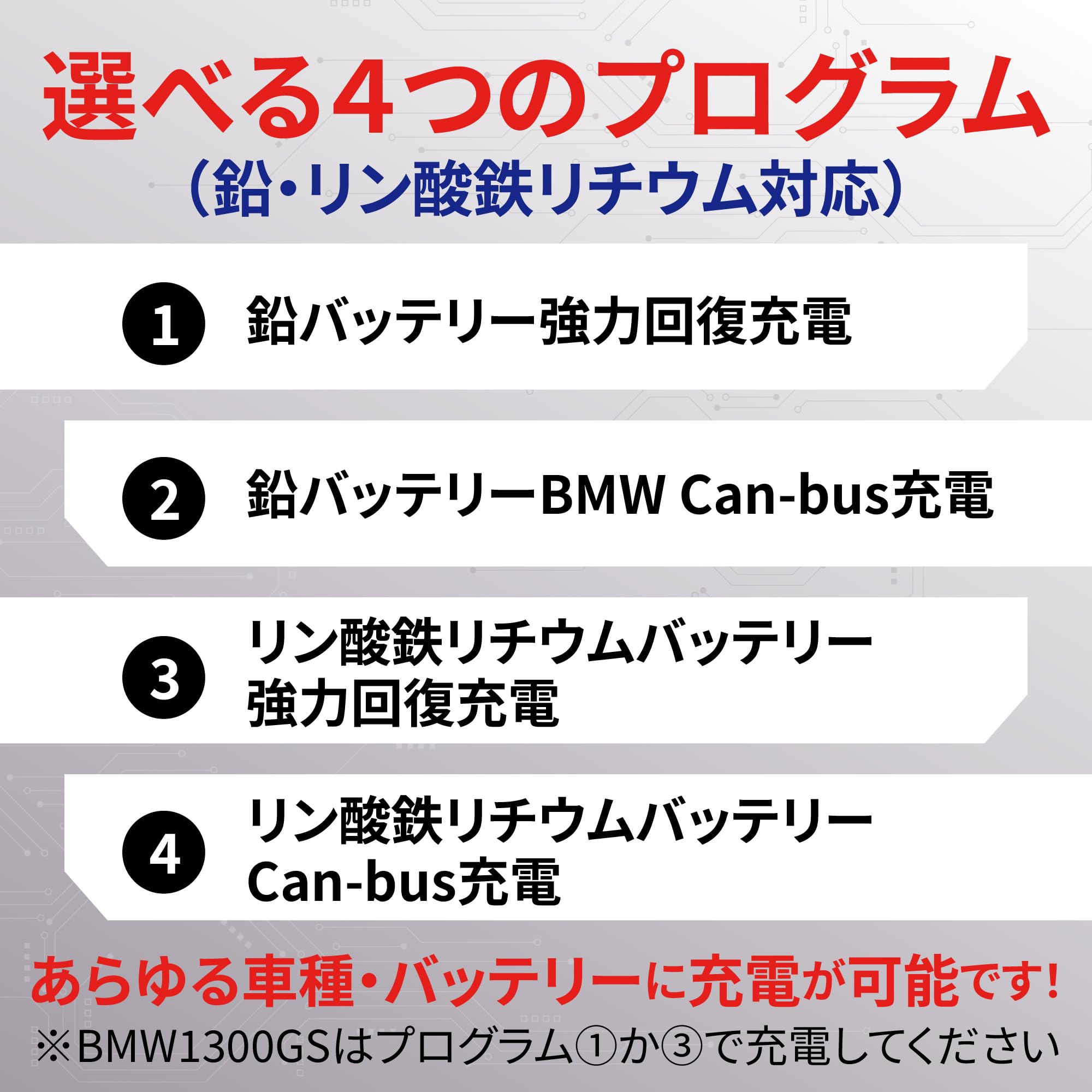 バッテリー回復機能、バッテリー診断機能、ショート防止機能、キャンバス(ヘラーソケット)経由充電機能。