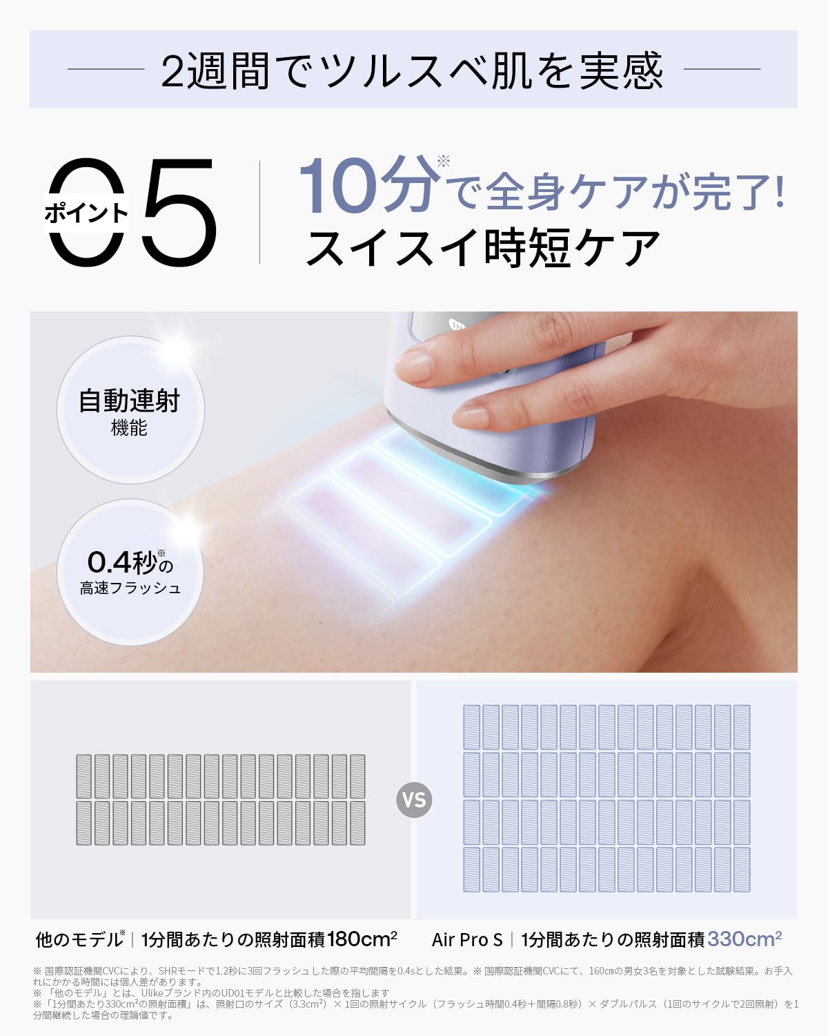 【時短で、簡単スピーディーなケア】自動連続照射モード搭載。手の疲労や負担を軽減しながらスムーズにケアを完了できます。自動連続照射モードなら、お肌に密着させながら滑らせるだけでOK!広範囲のお手入れもスピーディに(指・ワキ・VIOなどの細かい部分のピンポイントケアなら、手動照射モードでおすすめ)。全身ケアもわずか10分*³で完了、ケア時間をグッと短縮!忙しい日でもサクッとお手入れできるから、毎日のスキンケア感覚で続けられます。