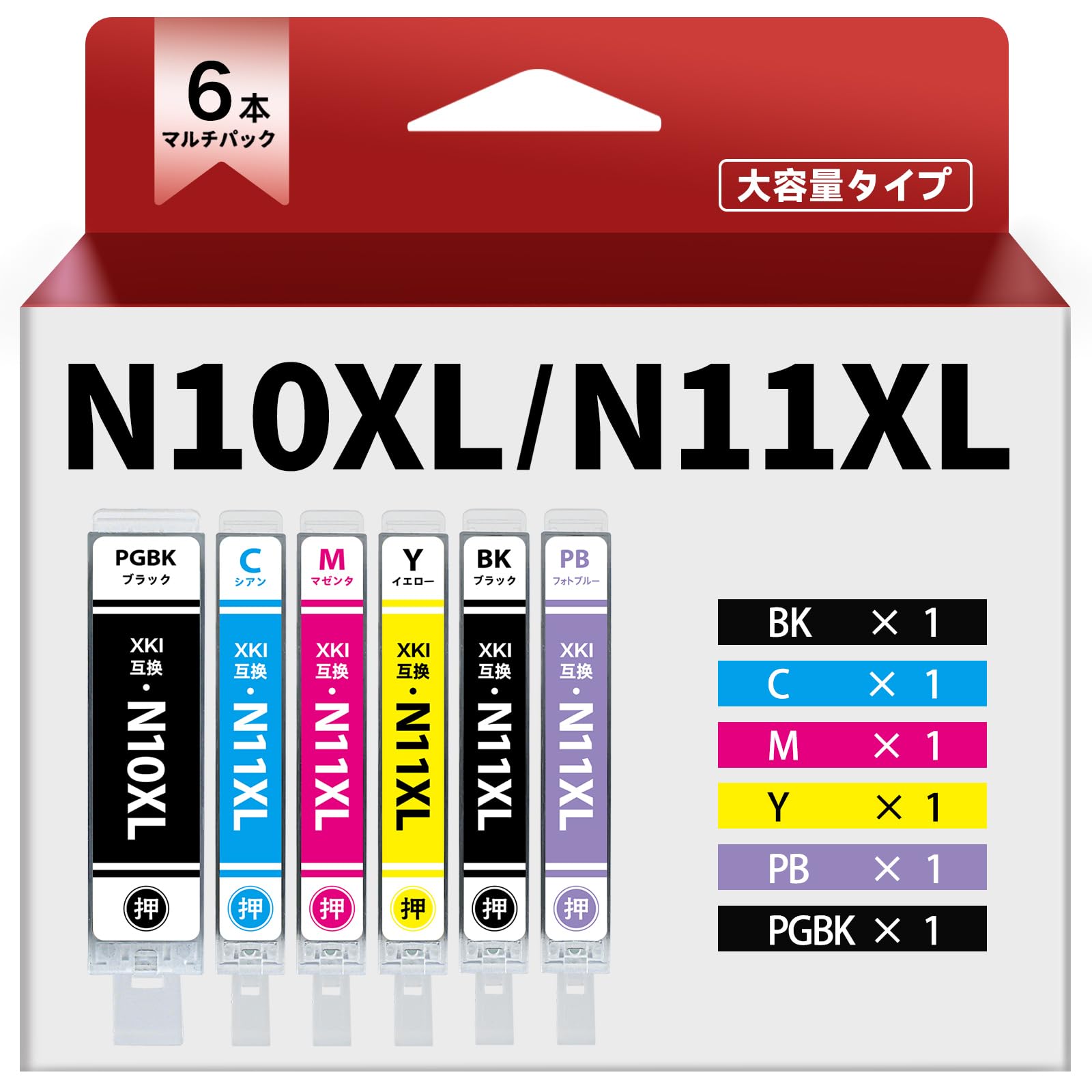 【商品仕様】 互換インクカートリッジ XKI-N10XL+N11XL / 6MP 6色パック: XKI-N10XLPGBK (ブラック) 1本 / XKI-N11XLBK (ブラック) 1本 / XKI-N11XLC (シアン) 1本 / XKI-N11XLM (マゼンタ) 1本 / XKI-N11XLY (イエロー) 1本 / XKI-N11XLPB (フォトブルー) 1本 ※メーカー純正品ではありませんが、純正品との併用は問題ありません。