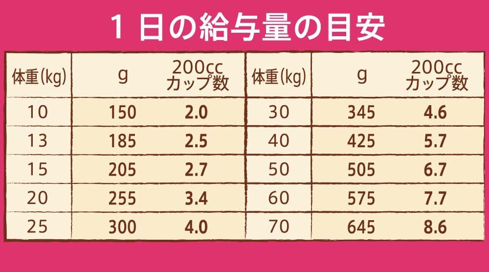 愛犬の体型や年齢などの1日に必要なカロリーに合わせ、適切な量を与えて下さい。