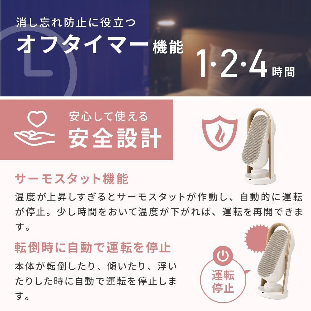 オフタイマー設定か可能(1・2・4時間)就寝前など設定できる便利な機能付き。安全装置も搭載しており、温度ヒューズ、サーモスタット、転倒時自動オフスイッチと安心してご使用いただけます。