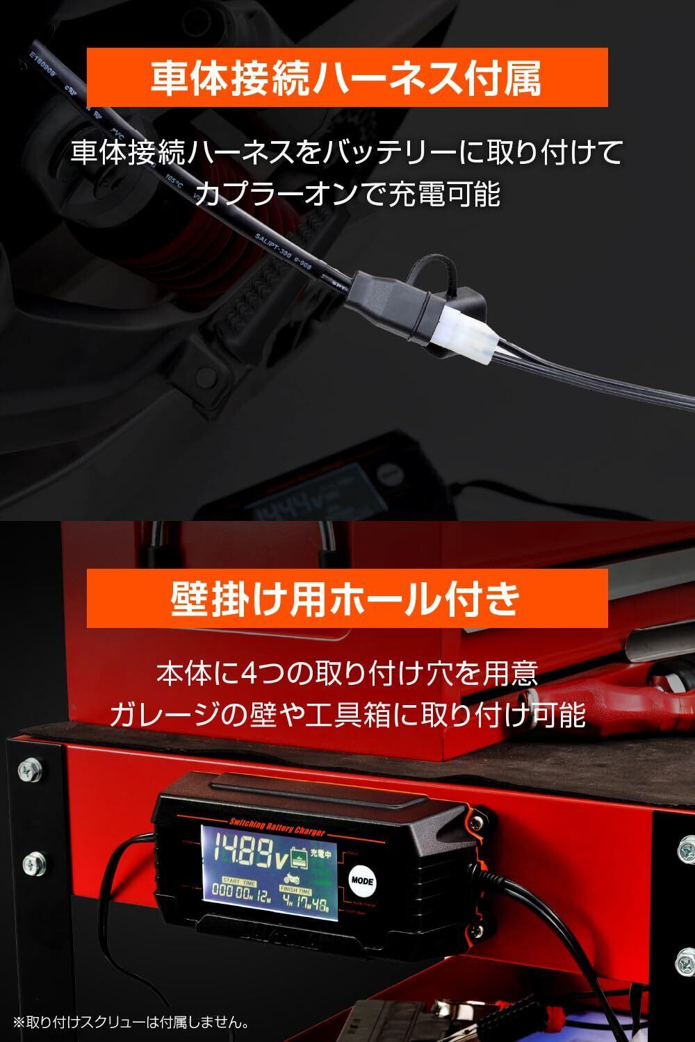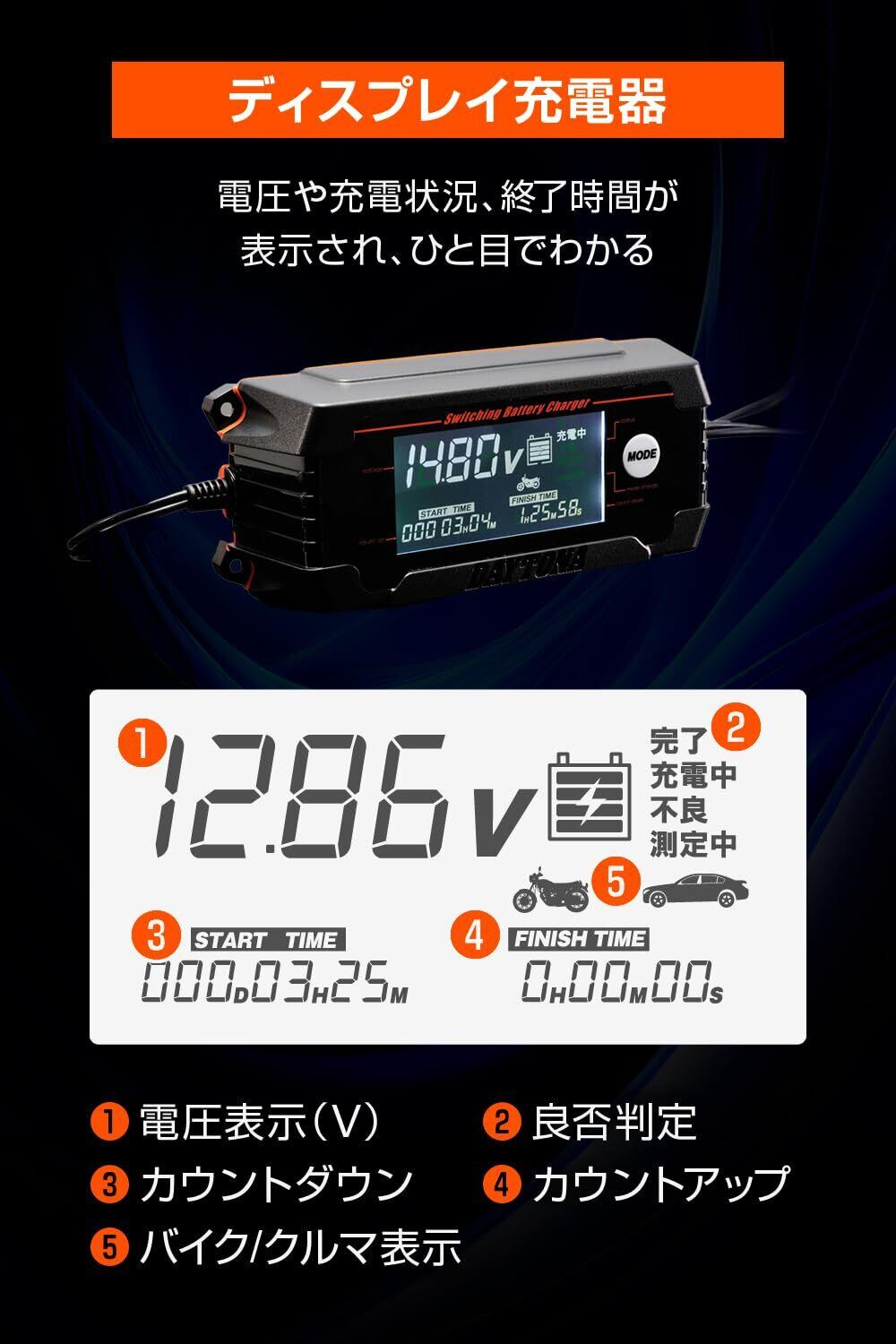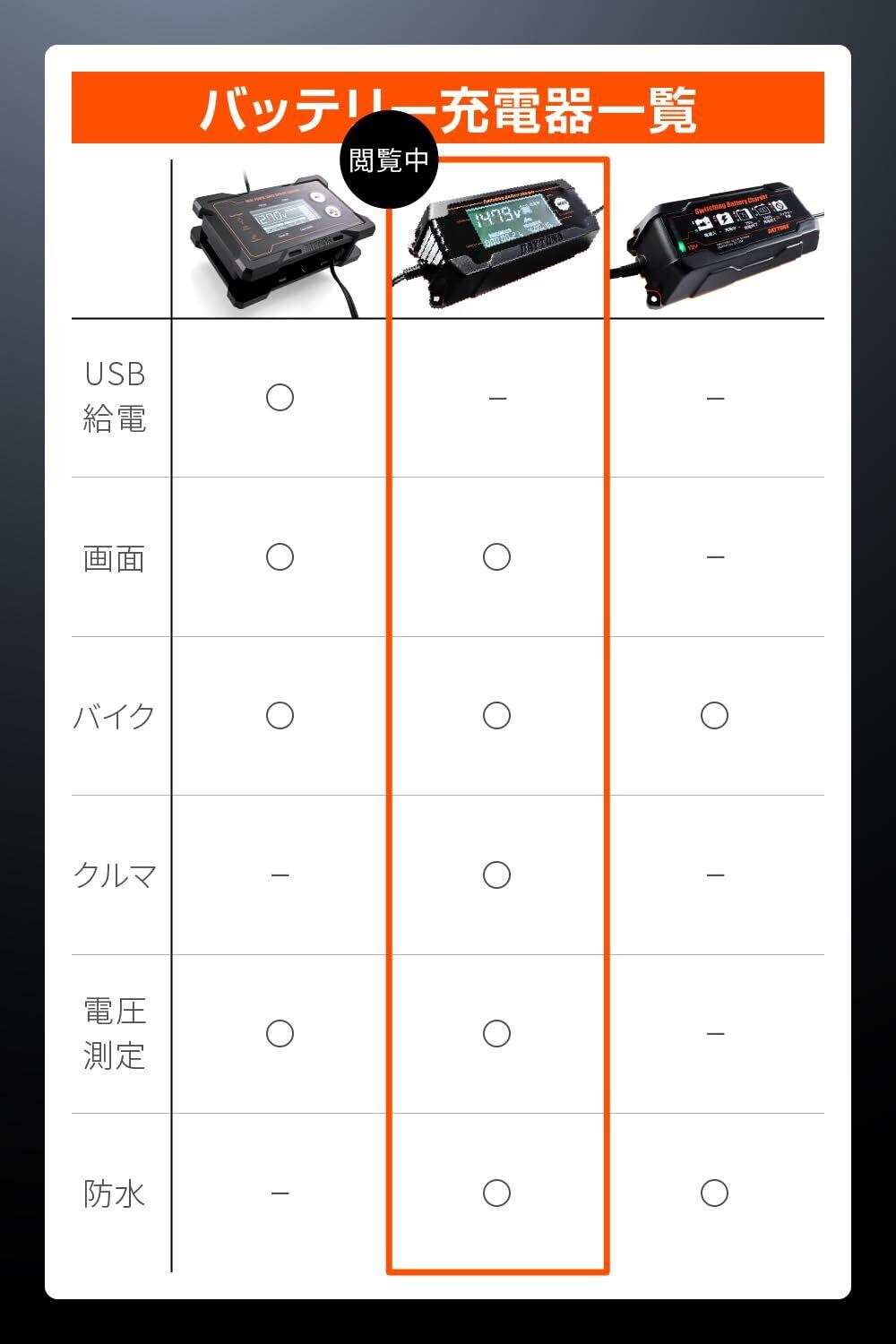 LCDディスプレイを採用。電圧、充電時間、充電状態などが一目でわかる。12V用で二輪から四輪(普通車)まで対応。全自動6ステップ充電タイプ。サルフェーション除去機能付き。
