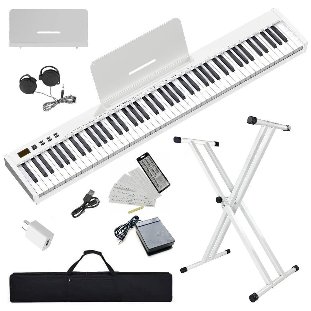 【付属品】練習用イヤホン(2Mケーブル)、初心者用鍵盤シール、バッグ、譜面台、ペダル、本体、充電器、充電ケーブル、日本語説明書も付属。購入日から30日以内無条件返品・返金保証、1年間無料修理、交換対応、お気軽に注文履歴で出品者にご連絡ください。注意:ご利用中に音が出ない、異常な音がでるなど不安定がある場合、電量不足になる可能性がありますので、まず3時間をフル充電してください。