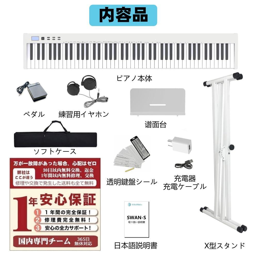 【人気商品】【ピアノスタンドセット】ニコマク NikoMaku 電子ピアノ 88鍵盤 SWAN-S 日本語表記 MIDI対応 コンパクト 軽量 スリムデザイン 充電型 初心者 スタンド ソフトケース ペダル 練習用イヤホン 鍵盤シール 日本語説明書付き 白 | ニコニコSHOP