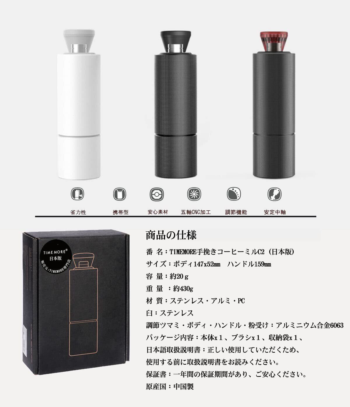 1.ブランド:TIMEMORE 型番:栗子C2 素材:外部:アルミ金属 刃:ステンレス 一部分:PC サイズ:本体147x52mm