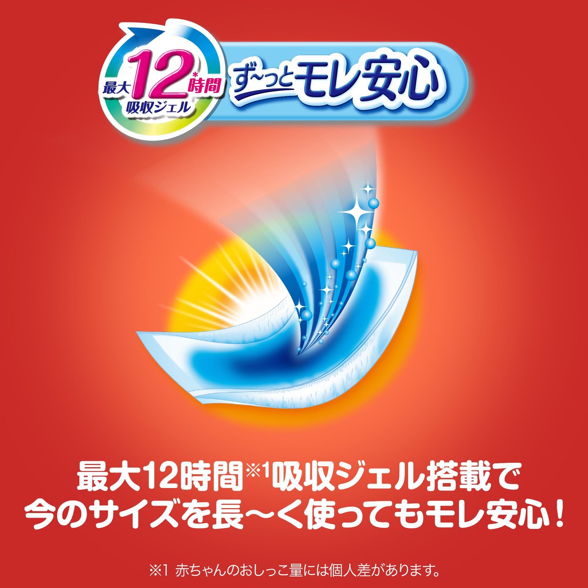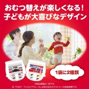 「最大12時間※吸収ジェル」採用のユニ・チャーム独自の吸収体が、繰り返しのおしっこをたっぷり引き込んで素早く吸収!ウエストは超ふわふわ!足回りは超なめらか!のびのびフィットで履かせやすいリニューアルしたトミカ・プラレールデザイン!うしろもまえもカラフル柄。※赤ちゃんのおしっこ量には個人差があります。※1当社従来品比