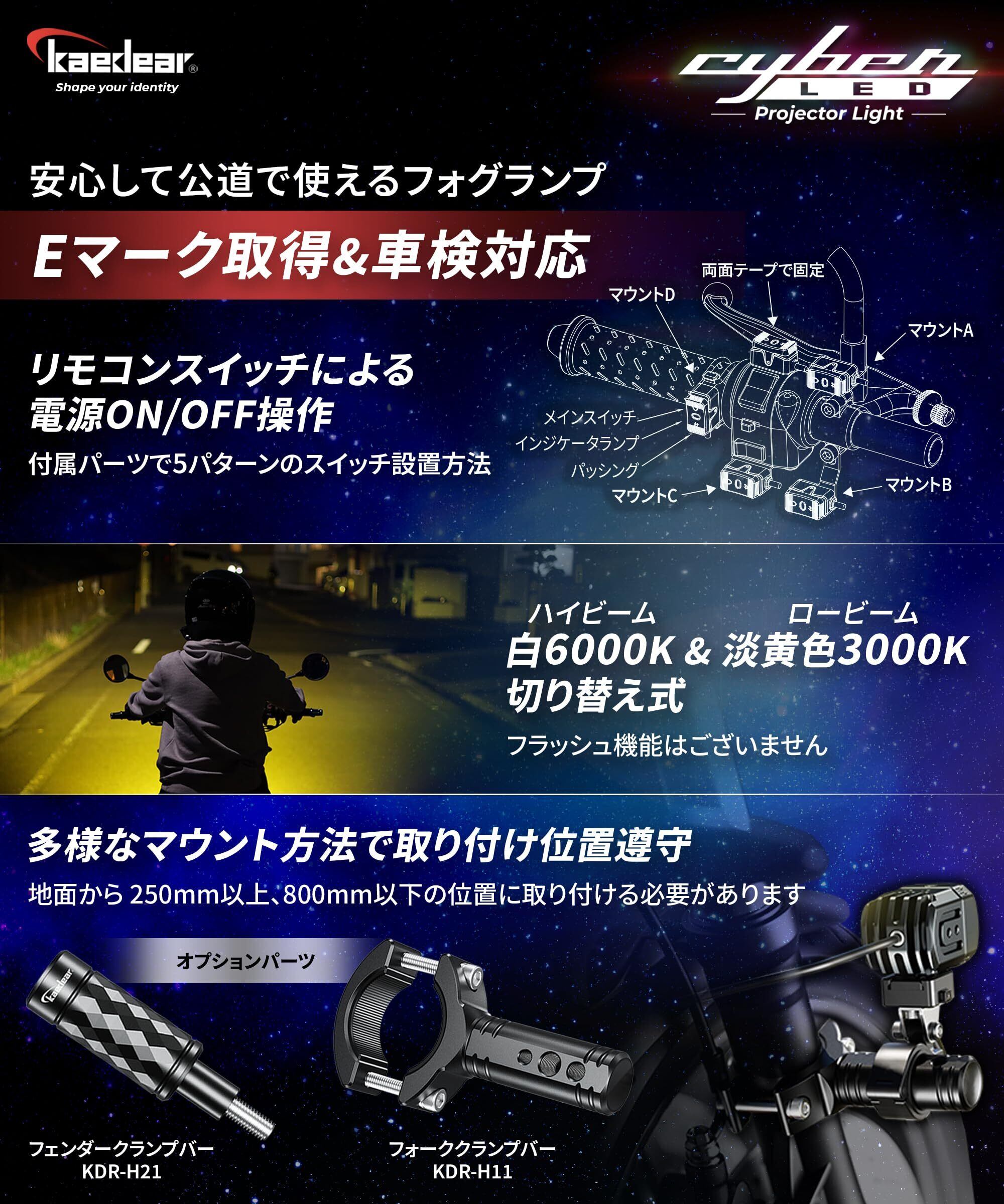 【在庫セール】Kaedear(カエディア) バイク LED プロジェクター フォグ ランプ 補助 ライト 汎用 15W×2灯 ホワイト 6000K / イエロー 3000K ケルビン 12V 防水 IP67 コントローラー Eマーク Cyber LED(サイバーLED) プロジェクター 車検対応 KDR-K10-W15 | ニコニコSHOP