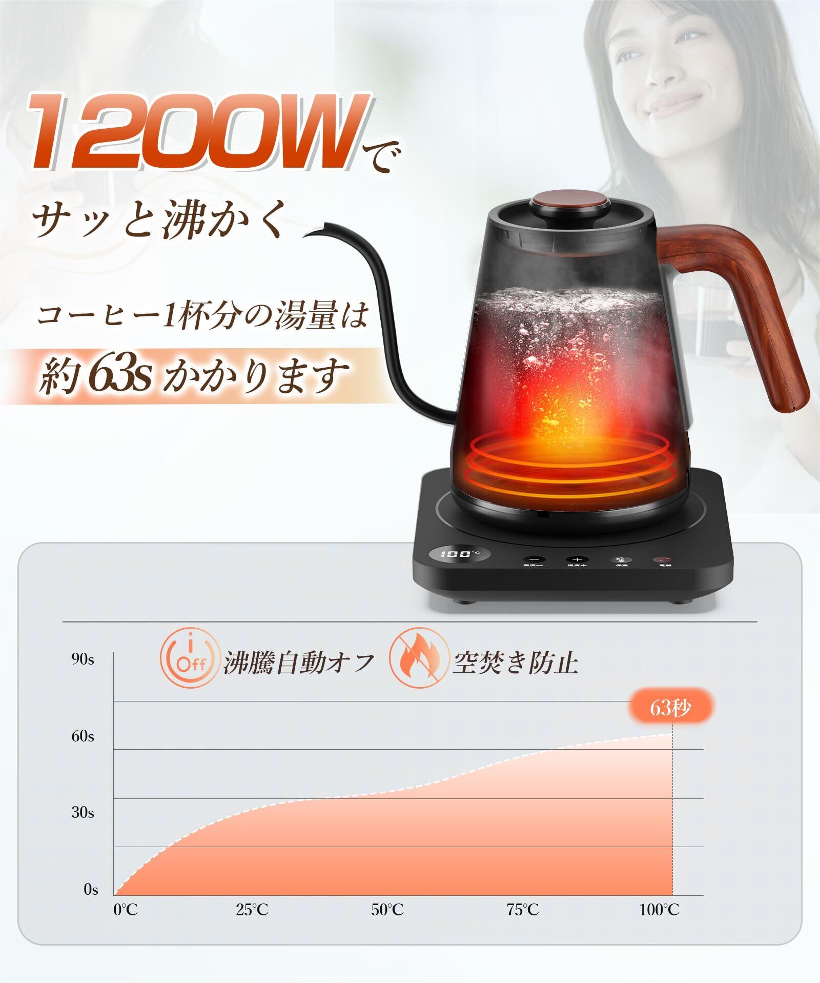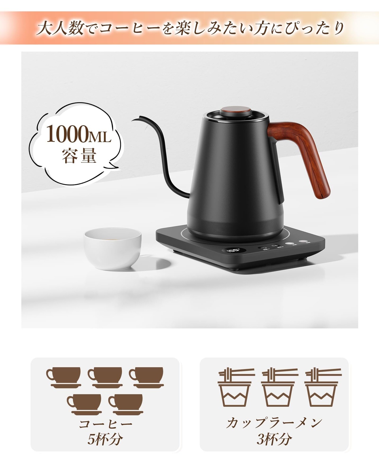 電気ケトル 電気ポット コーヒー1.0L 1200W ドリップ 1℃単位 温度調整 30分保温 自動電源オフ 空焚き防止 PSE認証済み 木目調 敬老の日 誕生日 結婚記念日 クリスマス プレゼント ブラック