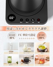 特徴 6mm極細注ぎ口、40℃から100℃まで1℃単位で自由調節、1200Wハイパワー60秒で1杯分沸騰、30分間保温機能、空焚き防止機能、自動電源オフ機能