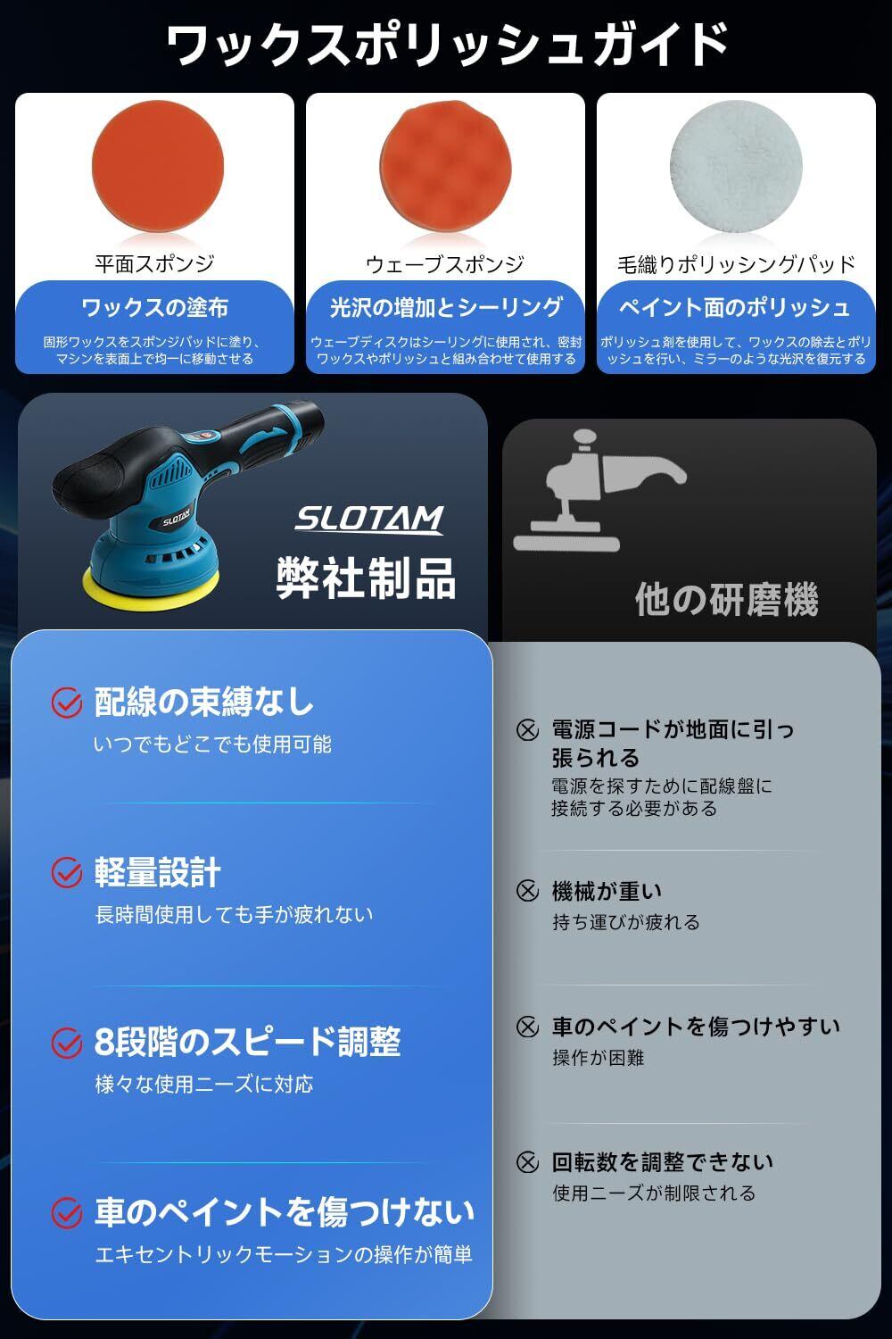 【用途が広い、充実したアクセサリー】: 平面スポンジ *1、ウェーブスポンジ *1、サンドペーパー *2、ウールパッド *2、繊維パッド *2、ウールパッド *1、大容量バッテリー *2、充電器 *1、ポリッシャー本体 *1、レンチ *1。ポリッシャーの豊富なアクセサリーは、さまざまな場面や異なる素材の表面のケア、磨き、研磨を可能にし、ポリッシャーの用途をより幅広くし、追加のアクセサリー購入の必要がなく、1台のポリッシャーで多様なニーズを満たすことができます。自動車のワックスや磨きだけでなく、家具の研磨、大理石の磨き、金属製品の錆落としにも対応し、さらに幅広い用途が可能です。