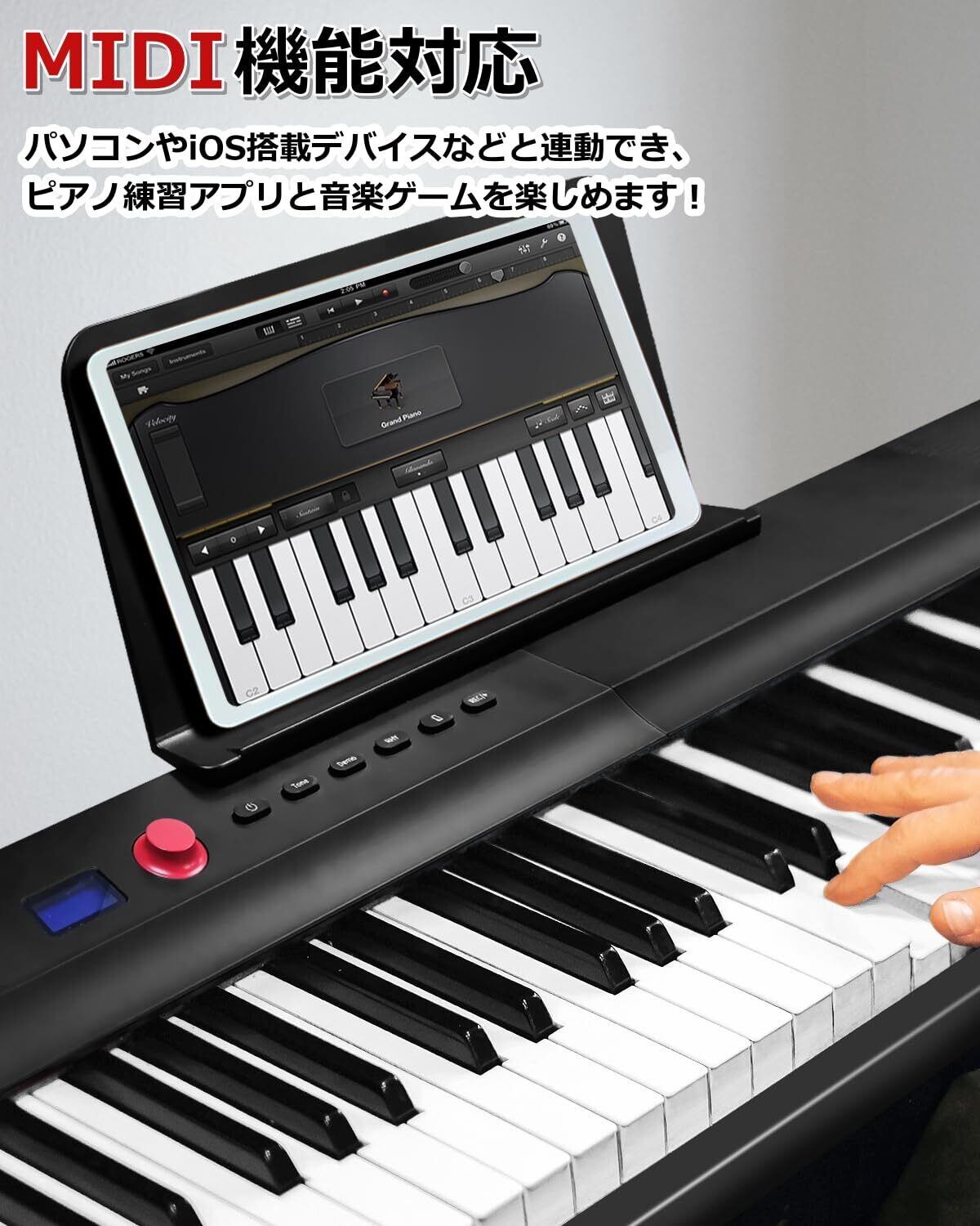 【指力感知機能持ち】指力感知機能センサーが搭載されることにより、演奏者の指の力に応じて音が変化できます!【折り前後のサイズと軽量で携帯便利】ピアノ本体は二つ折り前のサイズは126.3*25*6.5cm、二つ折り後のサイズは63.3*25*13㎝です。本体重量がわずか5kgで、専用ケースも付いているので、専用ケースも付属しており、音楽が必要な場所に持参し、どこでもコンサートを楽しむことができます。