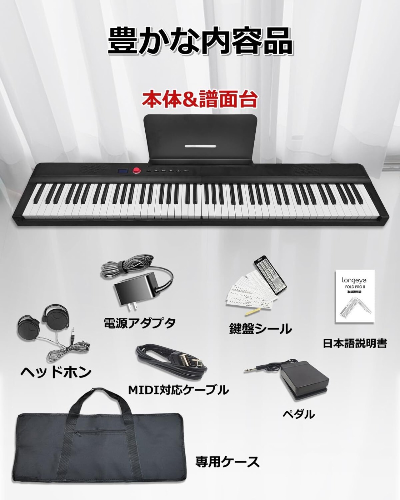 【新春セール】【音質アップ 折り畳み式】 Longeye 電子ピアノ 88鍵盤 FOLD PRO II 充電型 給電利用可 本格ペダルポート対応 生ピアノと同じ鍵盤サイズピアノ 本格MIDIポート対応 ペダル付属 バッテリー内蔵 練習用イヤホン 128種音色 専用ケース付き 鍵盤シール付き 携帯型 軽量 小型 日本語説明書(黒色) | ニコニコSHOP