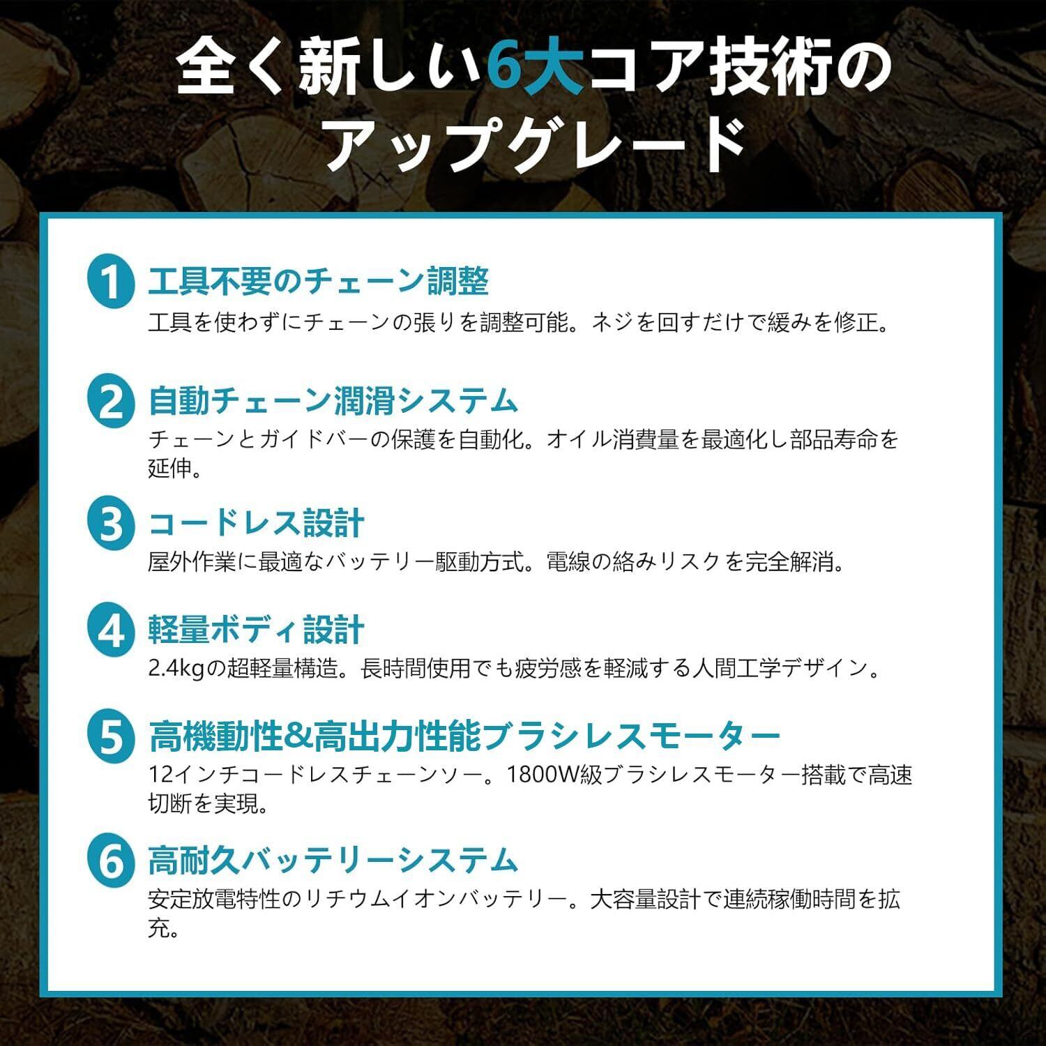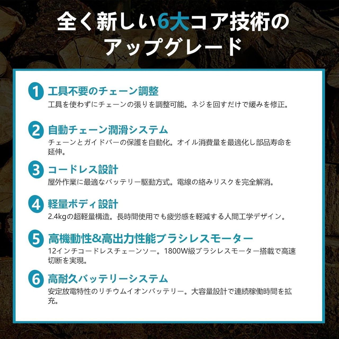 【12インチコードレスチェーンソー】重量はわずか3kg、切断径は350mm、2つの大容量4000mAhバッテリー(18Vバッテリー互換)を装備し、電源に接続する必要がないため、屋外作業に最適です。家庭のDIYから樹木の伐採まで幅広く対応します。専用の収納ケース付きで、軽量かつ持ち運びが容易です。