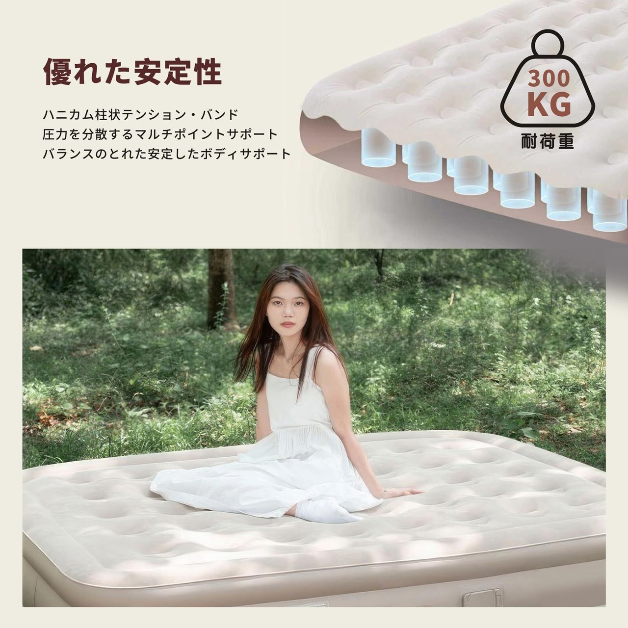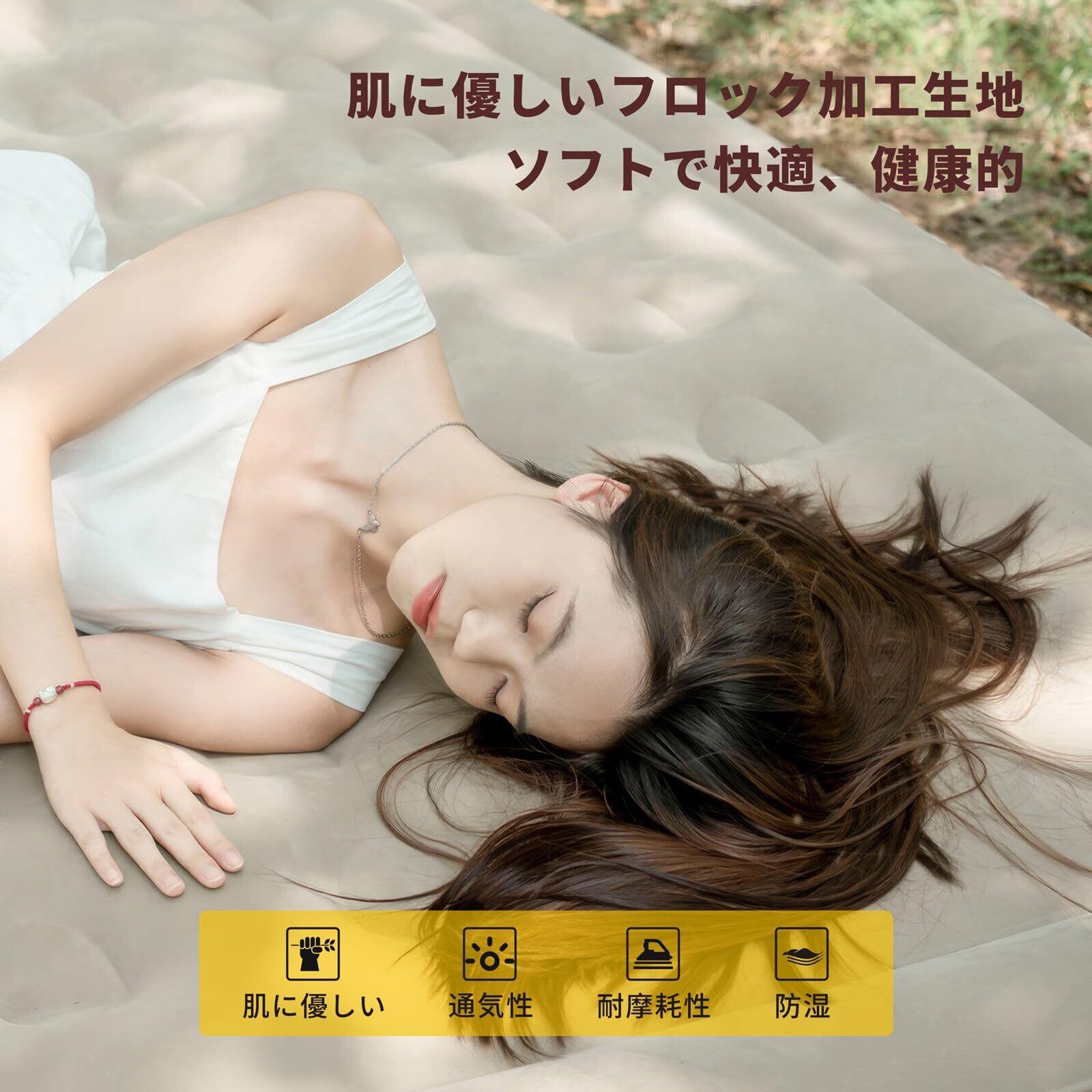 【アップグレードされた素材、寝心地】このエアマットレスは表面に柔らかいスエード素材を使用しており、肌触りが良く、通気性と防水性に優れています。 安定性に優れた特殊ハニカム構造を採用し、耐荷重は約300kg。 支柱のマルチポイントサポートが体圧を分散し、体の沈み込みを防ぎます。 ボトムとサイドは耐久性に優れたPVC製で、穴あきや変形を防ぎ、長期間の使用が可能です。