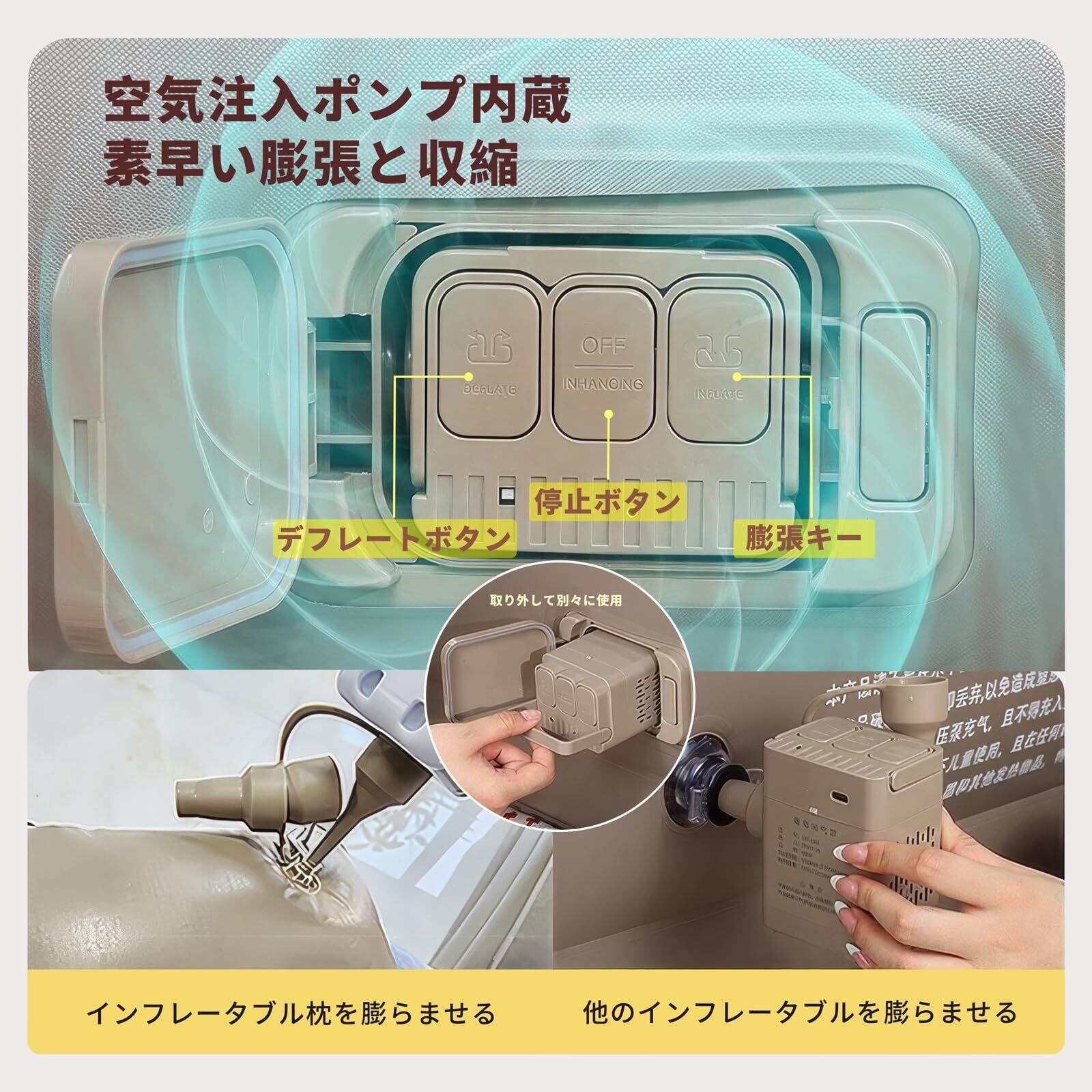 【電動ポンプ内蔵、自動膨張】この自動膨張式エアマットレスは電動ポンプを内蔵し、別途購入する必要がなく、取り外して使用することができます。 ボタン一つで自動膨張/自動収縮、素早く膨らませることができます。 電動ポンプは非常灯としても使用できます。 注意:使用前に電動ポンプをよく充電してください。