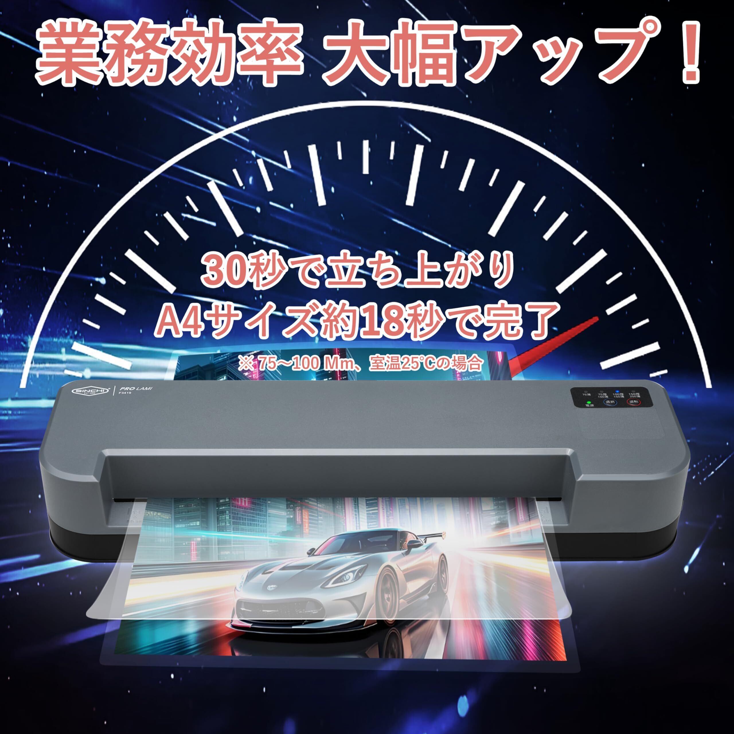 【高い生産性】30秒の高速ウォームアップと最速1分で100cmのラミネート速度の組み合わせにより、ラミネート作業にかかる貴重な時間を節約できます。例えば、100μmのA4サイズフィルムを10枚ラミネートするのにわずか4分しかかかりません。