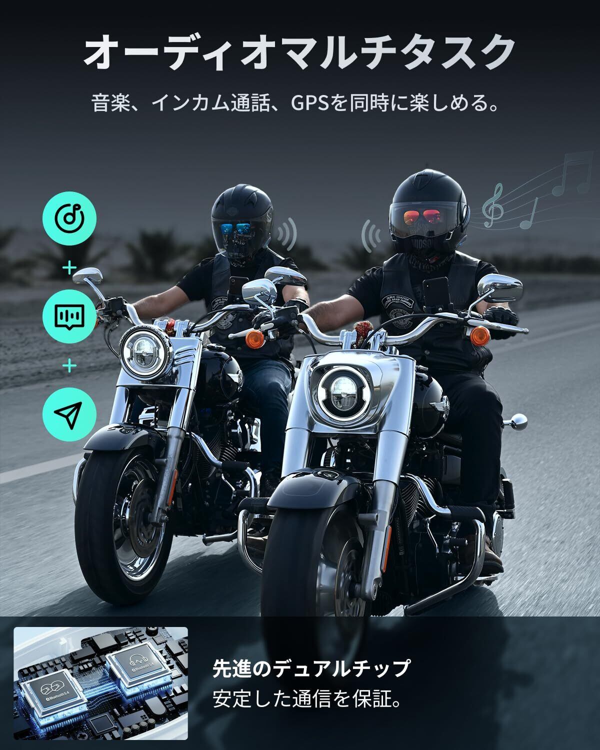 【音楽を聴きながら通話も可能】Bluetooth 5.4チップ2枚搭載で、音楽やナビゲーションを再生しながらも、スムーズにインカム通話が可能です。この機能は同ブランドのインカム同士での接続時に利用でき、複数のタスクを同時にこなせる便利さを提供します。ツーリング中もエンタメと通話が一体化し、より快適で便利な体験を実現します。