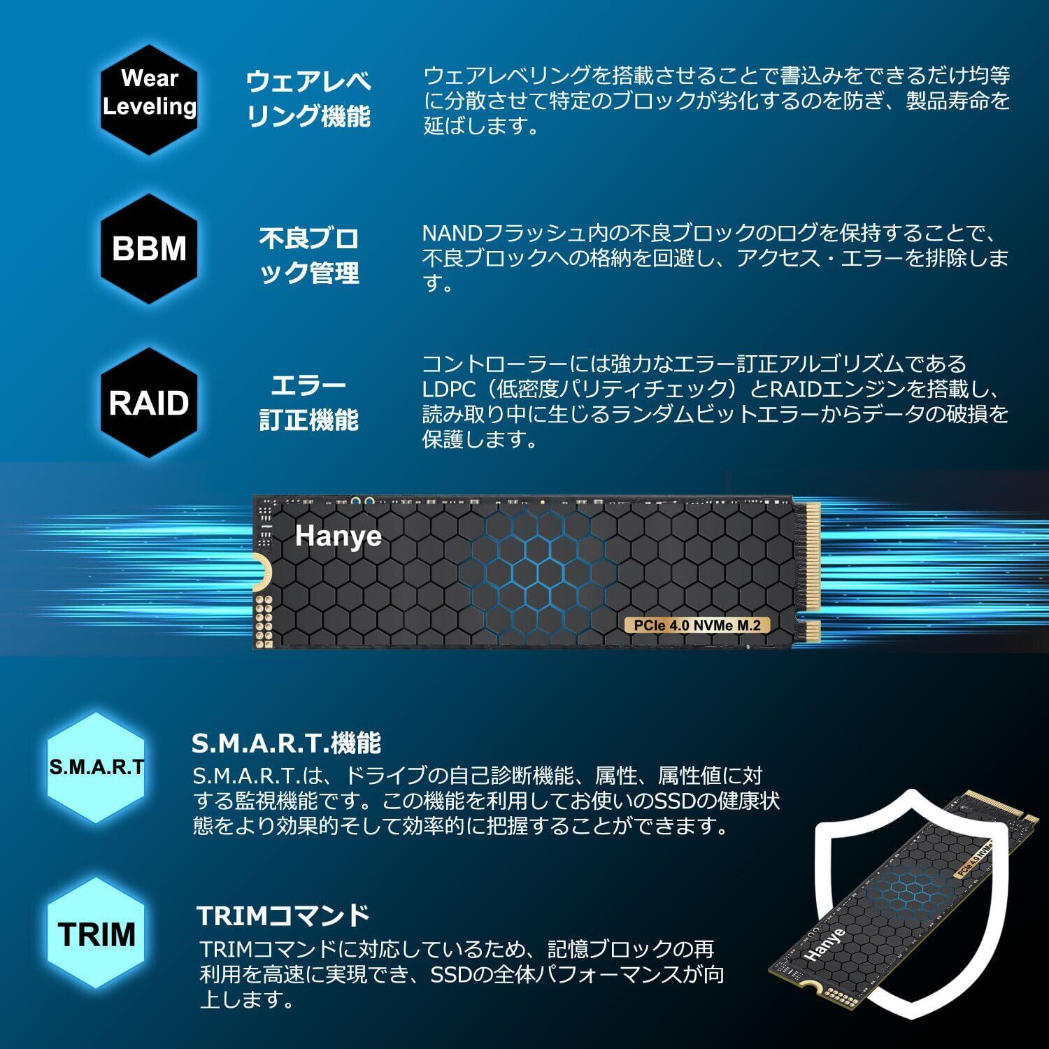 保証:安心の国内サポートと5年 Hanye Technology Co., Ltd. 保証。※保証は、最初の購入日から5年間、または製品データシート上(取扱説明書)に記載されている最大書き込みバイト総数1200Terabytesが書き込まれるまでのうち、いずれか早く到達する日まで有効です。※本製品にマザーボードにM.2 SSDを固定するためのネジは付属しません。