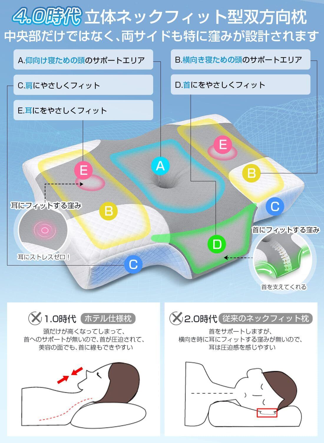 【2025新登場!耳と後頭部の凹型中空設計】60D密度の低反発素材と人間工学に基づく特殊形状により、寝ている間に自然なカーブを保ち首を支えてくれるLAOGOT 4.0時代立体ネックフィット双方向枕です。中央のくぼみ設計により後頭部の形に沿って通気性とフィット感を高めます。そして、横向き寝の際にも両サイドのくぼみ設計により、夜中に寝返りが出来なくて何度もが覚めたことはありません。耳は圧迫感を感じにくく、骨もまっすぐになるように体にフィットします。また、前部が凸型の形状になっており、睡眠時に首や肩が浮いてしまわないように支えることができ、睡眠の質の向上に役立ちます。