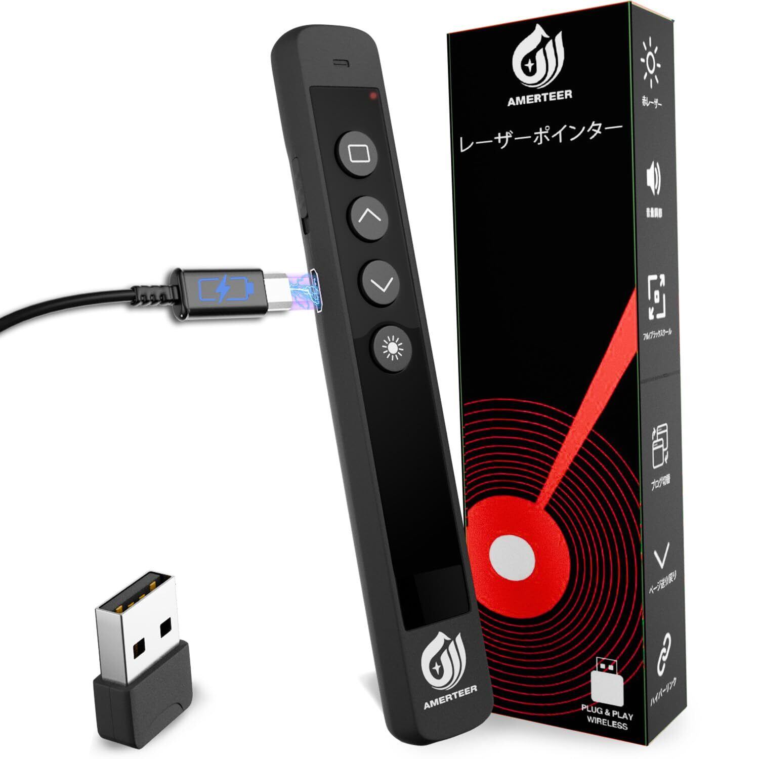 【特価セール】AMERTEER プレゼン用レーザーポインター、充電式PowerPointリモコン、PSC認証済み、ワイヤレスレーザーポインター、Googleスライド・Keynote用USBプレゼンター、収納パック付き(038 ブラック) | ニコニコSHOP