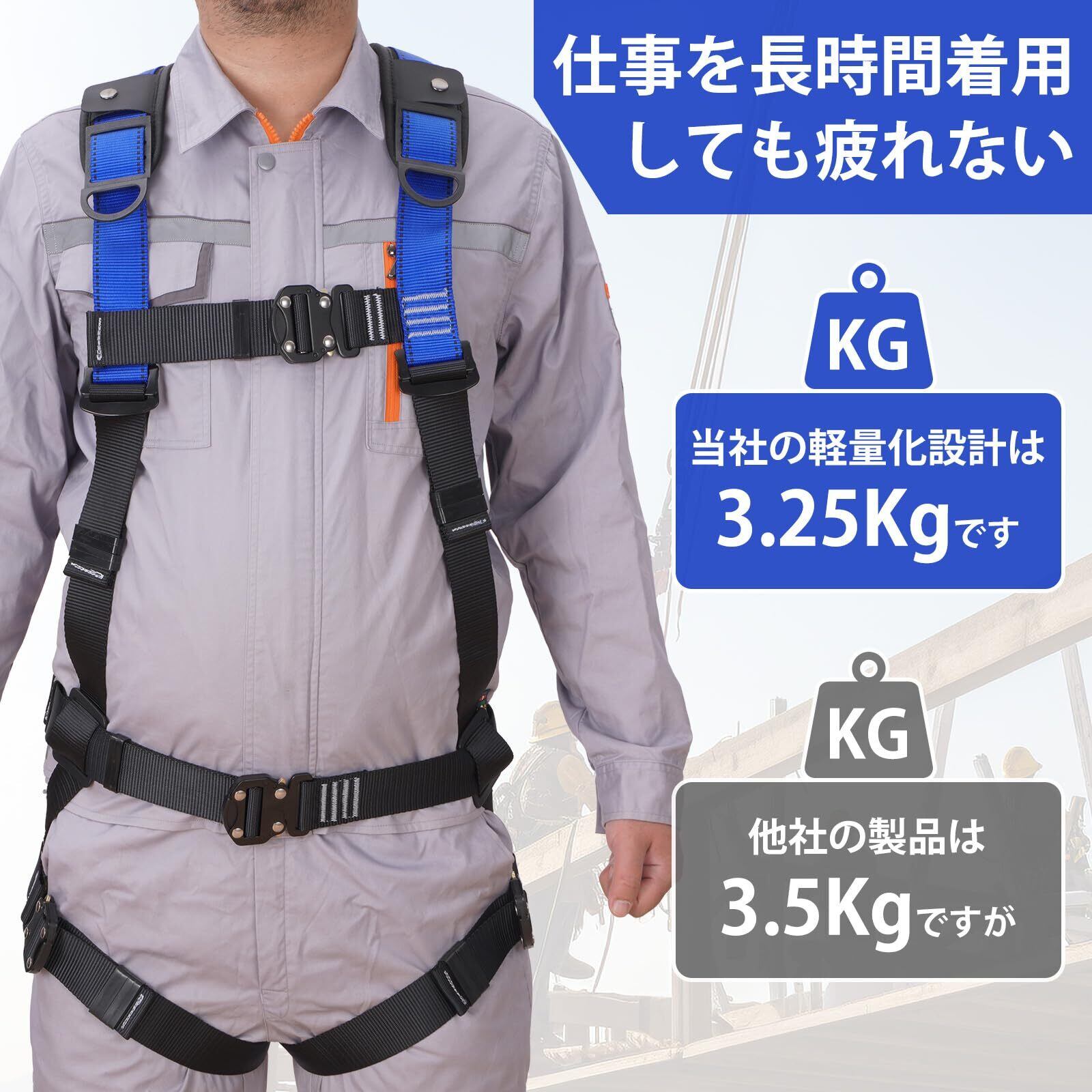 【軽量化、長時間の装着も疲れない】軽量設計により、弊社の安全ハーネスは他社の3.5kgに比べて3.25kgまでに軽減!
