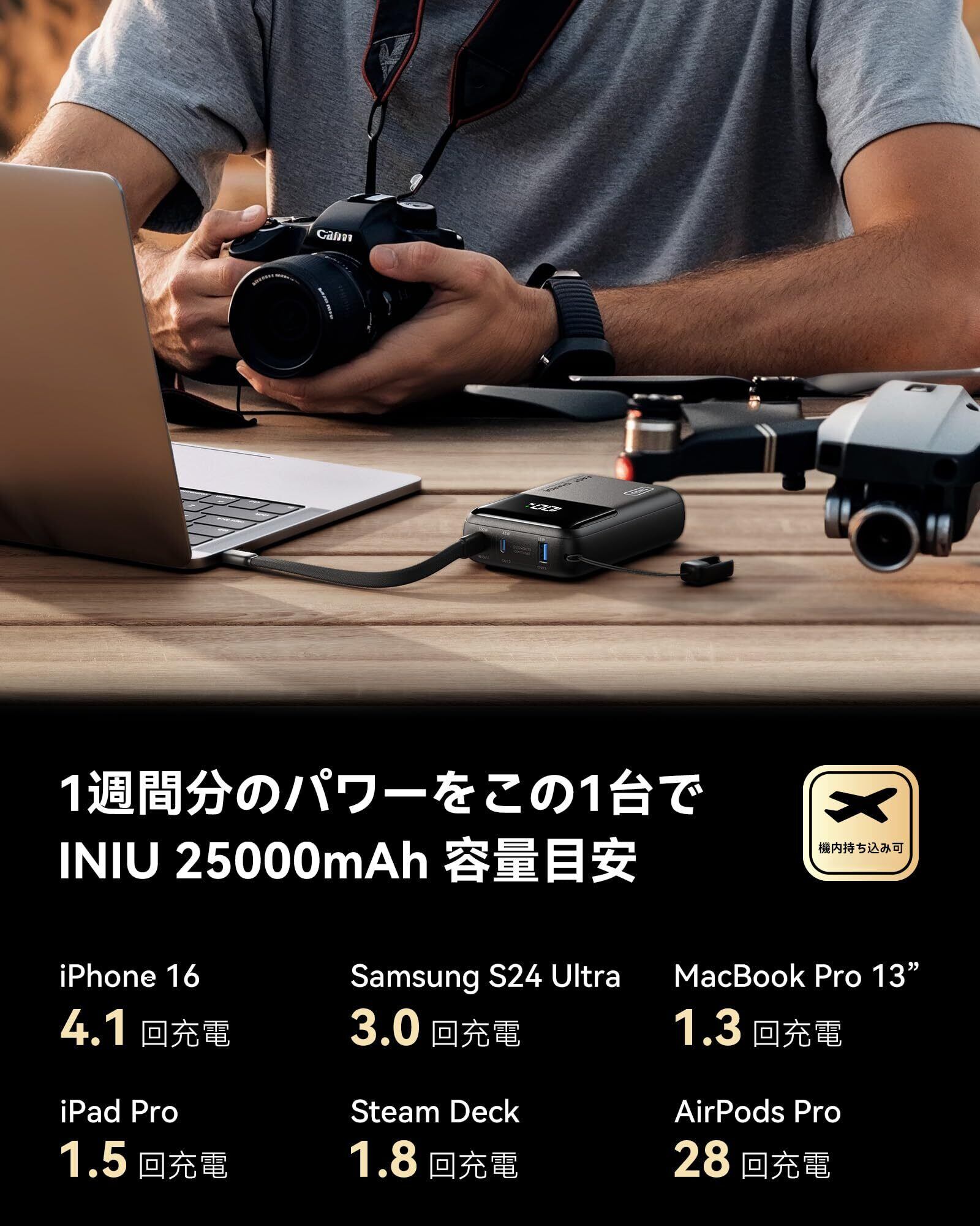 【人気商品】INIU P63 モバイルバッテリー 100W 大容量 25000mAh 超コンパクトサイズ 急速充電【USB-C入出力ポート PSE認証済 3台同時充電】ストラップ式USB Cケーブル付きモバイル・バッテリー ノートPC・タブレット・スマホ用 機内持ち込み可能 アウトドア/防災/緊急用の必携品 MacBook iPhone 16 / 15 & Android iPad その他各種対応【ブラック】 | ニコニコSHOP