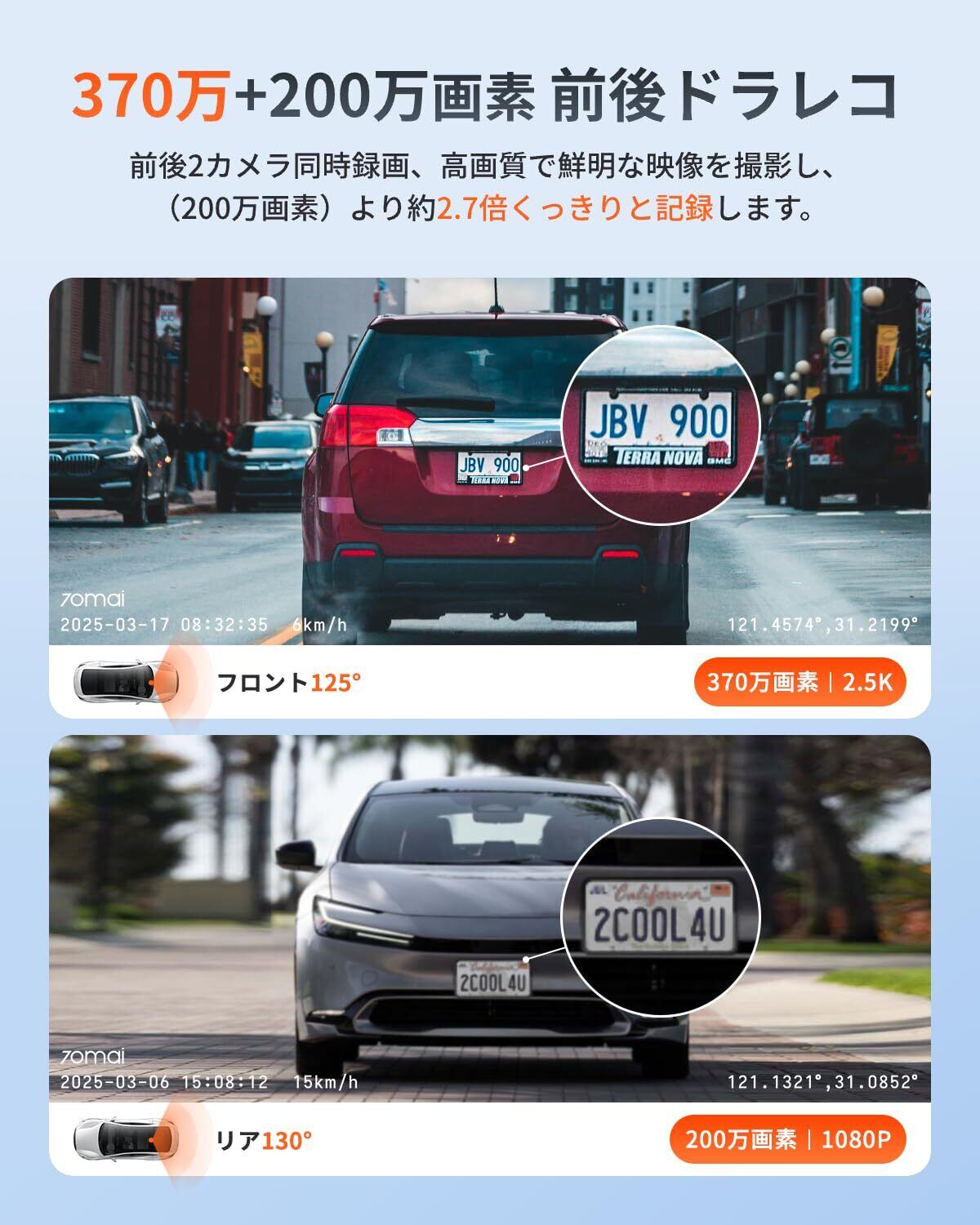 【前370万高画質+後200万画素で同時録画】370万画素の高画質で鮮明な映像を撮影するドライブレコーダー-です。従来の200万画素カメラより1.78倍鮮明で、ナンバープレートや道路標識をより鮮明に捉え、日中でも低照度下でも細部まで鮮明に映し出す。リアカメラも200万画素(1080FHD)のよい画質で、万一後ろからのトラブルや予期せぬ事故が起きた時の後方車ナンバープレートが記録できます。リアカメラのケーブルの長さは6メートルで、車両と配線方法に基づいて延長ケーブル(別売りでながさ3.5メートル)が必要かどうかをご確認ください。リアカメラが安定して本体に接続されることをご確認ください。