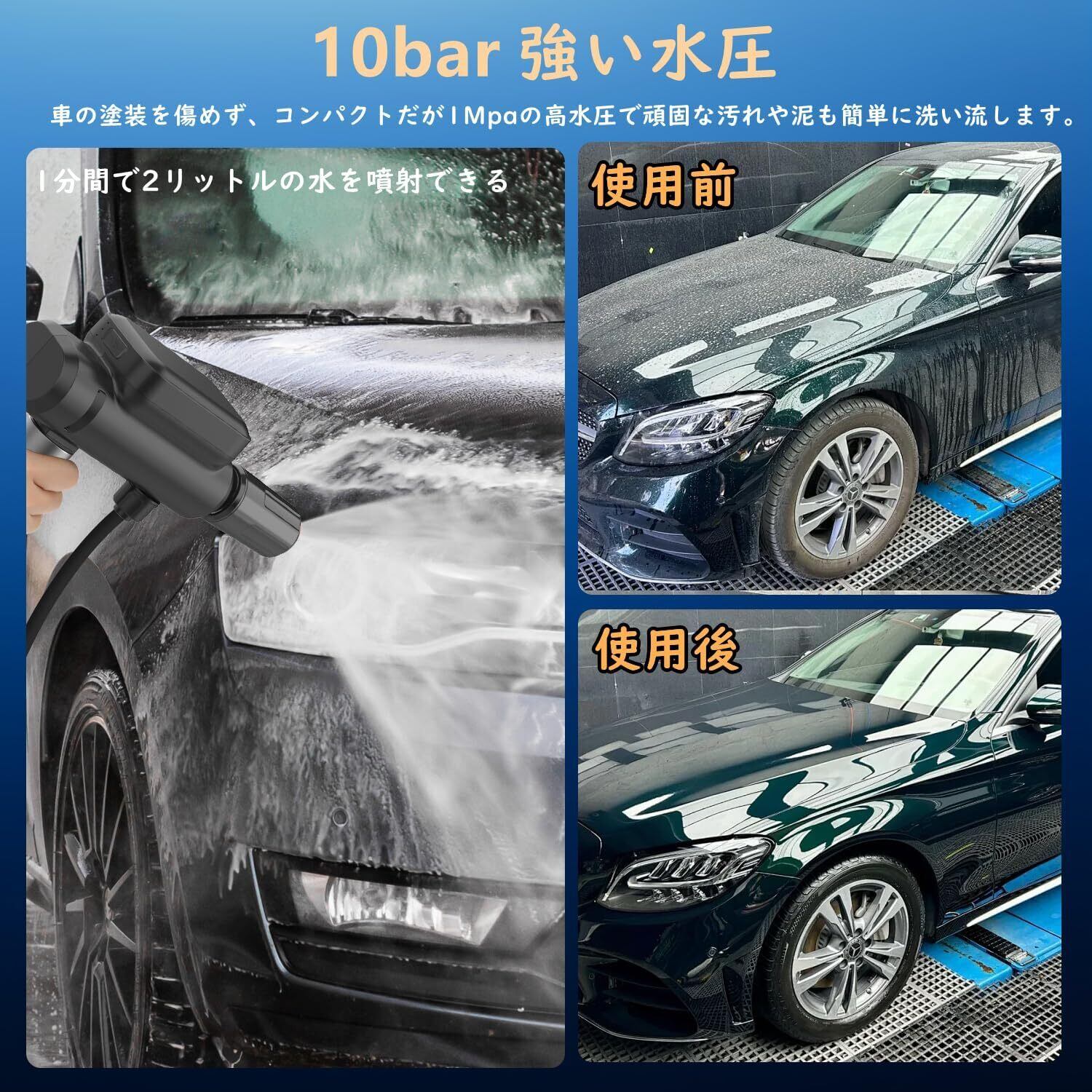 【様々なシーンで活躍】洗車だけではなく、ベランダや玄関周り、お風呂場の洗浄、庭の水やり、お墓掃除など様々なシーンで大活躍可能なポータブル高圧洗浄機です。日々の取り出し片付けも簡単なので毎日使え、家庭でもアウトドアでも快適な便利さを実現しました。注意:①付属のホースでは、水道の蛇口に直接接続することは不可です。バケツをご用意ください。②注意:ペットボトルは取り付けできません。③使用開始から水噴射まで15〜50秒がかかります。電源を入れて起動音がする場合はしばらくそのままお待ちください。 本体と給水ホース内の空気を抜いてから水が吸い上げられます。