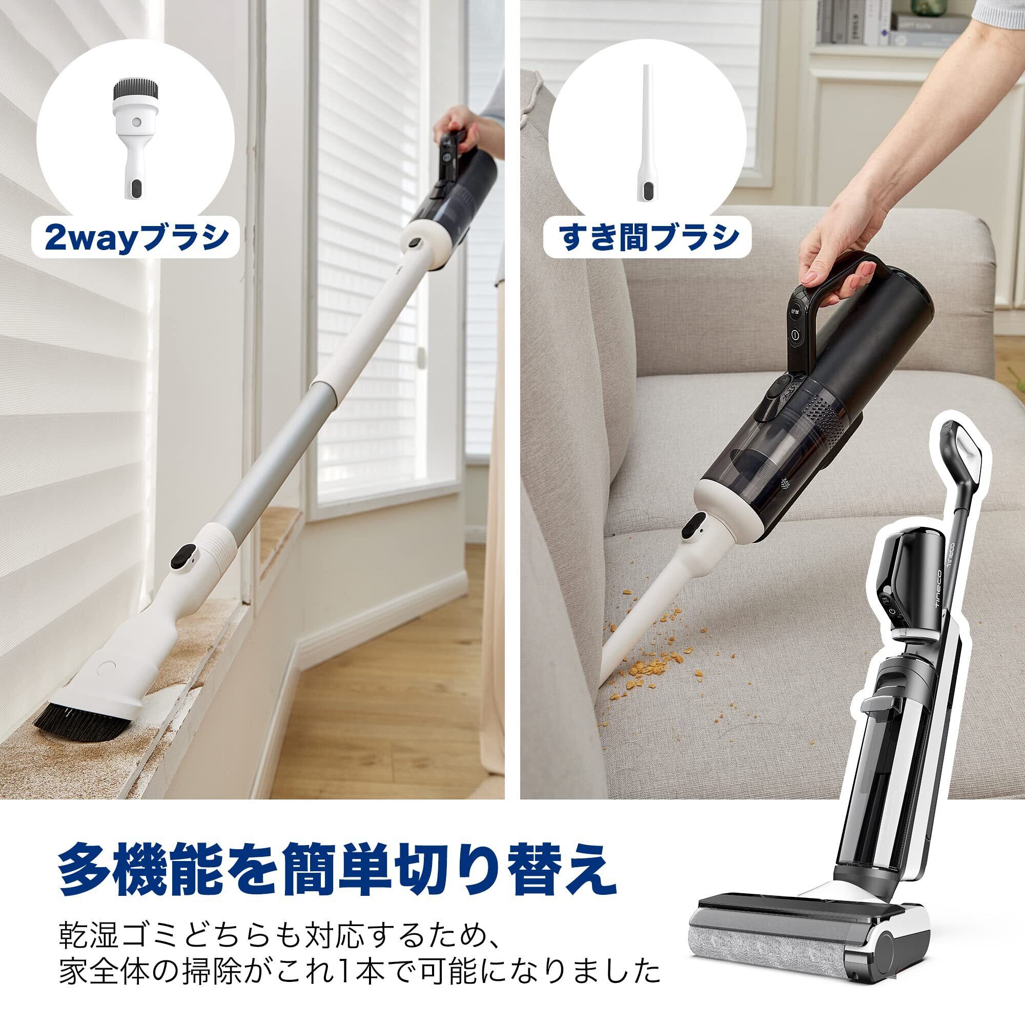 【吸引+水拭き、乾湿両用で家中ピカピカ】 乾いたゴミも、液体汚れもこれ1台で対応!吸引と水拭きを同時に行える2-in-1設計で、日々の掃除が効率的に。メインユニットを取り外せば、ハンディ掃除機としても使用可能。リビングから車内まで、これ1本で対応できます
