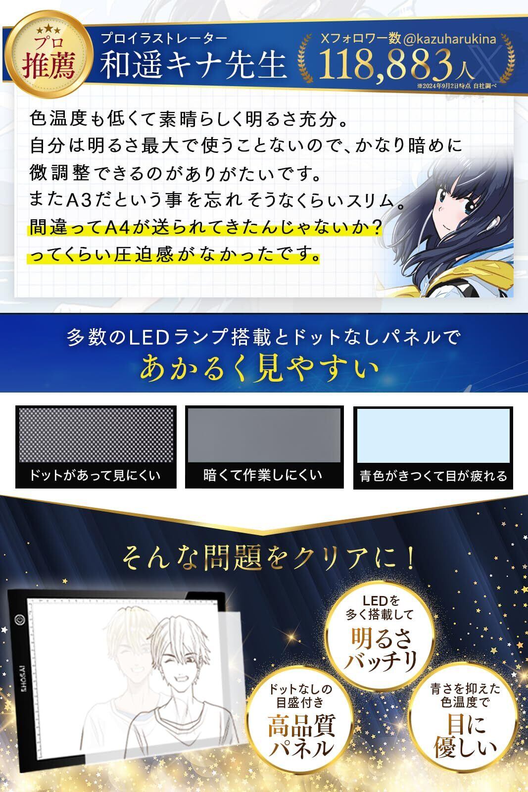 【軽量コンパクト設計】 従来の発光面サイズは保持し、限界まで 軽量 コンパクト 化を行いました。厚さ 4mm 重さは 598g 程度です。プロのイラストレータ様に推薦いただいており、自信を持って商品をお届けします■パネルは高品質なものを採用し明るくみやすいので スクリーントーン トレース作業 イラスト作成 製図 写し絵 に最適です