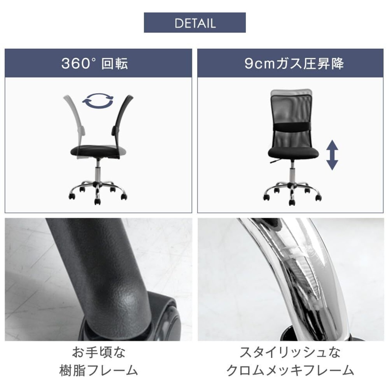【素材】張り地:オールメッシュ生地(ポリエステル100%)、内部:ウレタンフォーム、フレーム:スチール(クロムメッキ加工)、キャスター:ナイロン