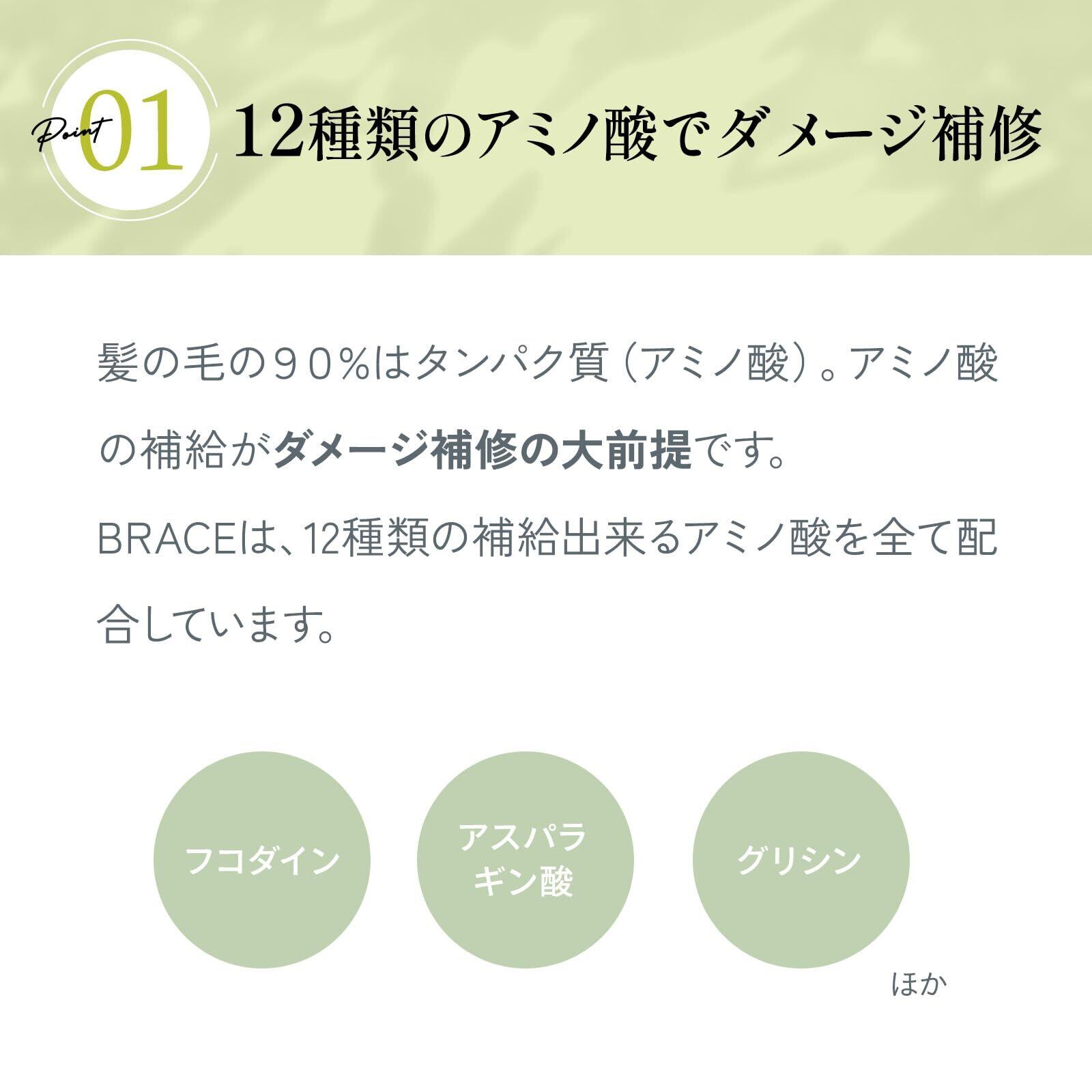 【12種類のアミノ酸で内側からきれいに】「プロリン」「アスパラギン酸」「グリシン」をはじめとした、12種類の補給できるアミノ酸を全て配合。髪の補修に必要な成分を必要なだけ配合。見せかけのツヤ髪と別れ、本当のアナタを見つけましょう。