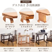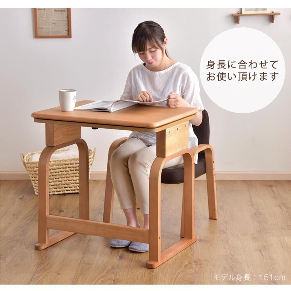 【こたつ本体】[サイズ]:天板:幅70×奥行50cm デスク天板までの高さ:55、60、70cm(3段階調節) [素材]:天板表面材:PVCシート 脚:ラバーウッド積層合板 (PU塗装) [重量]:15.2kg [耐荷重]:約20kg