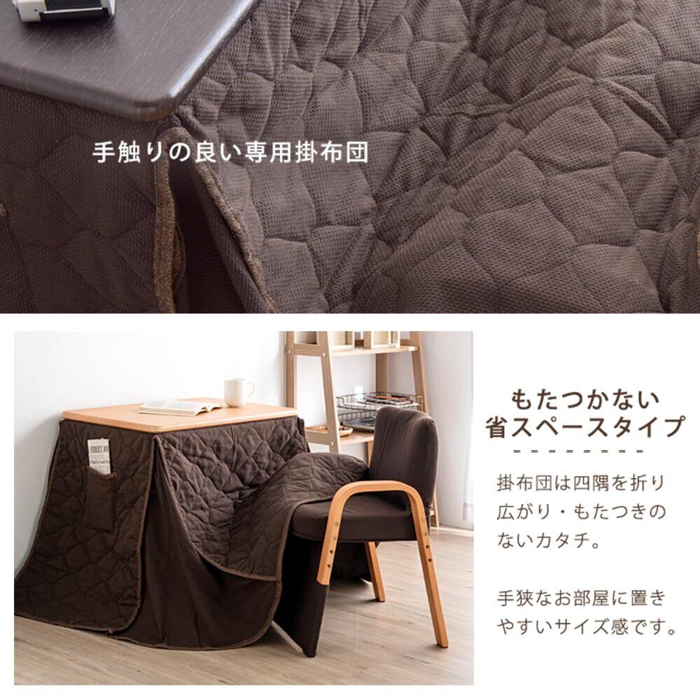 【備考】こたつ・ヒーター:組立品、インドネシア製 こたつ布団:インドネシア製、ドライクリーニング可 チェア:組立品、インドネシア製 ※こちらの商品は、2017年8月10日に天板の材質をラバーウットから現行の仕様に変更し、2018年10月入荷分より椅子に温熱ガードをつけました。