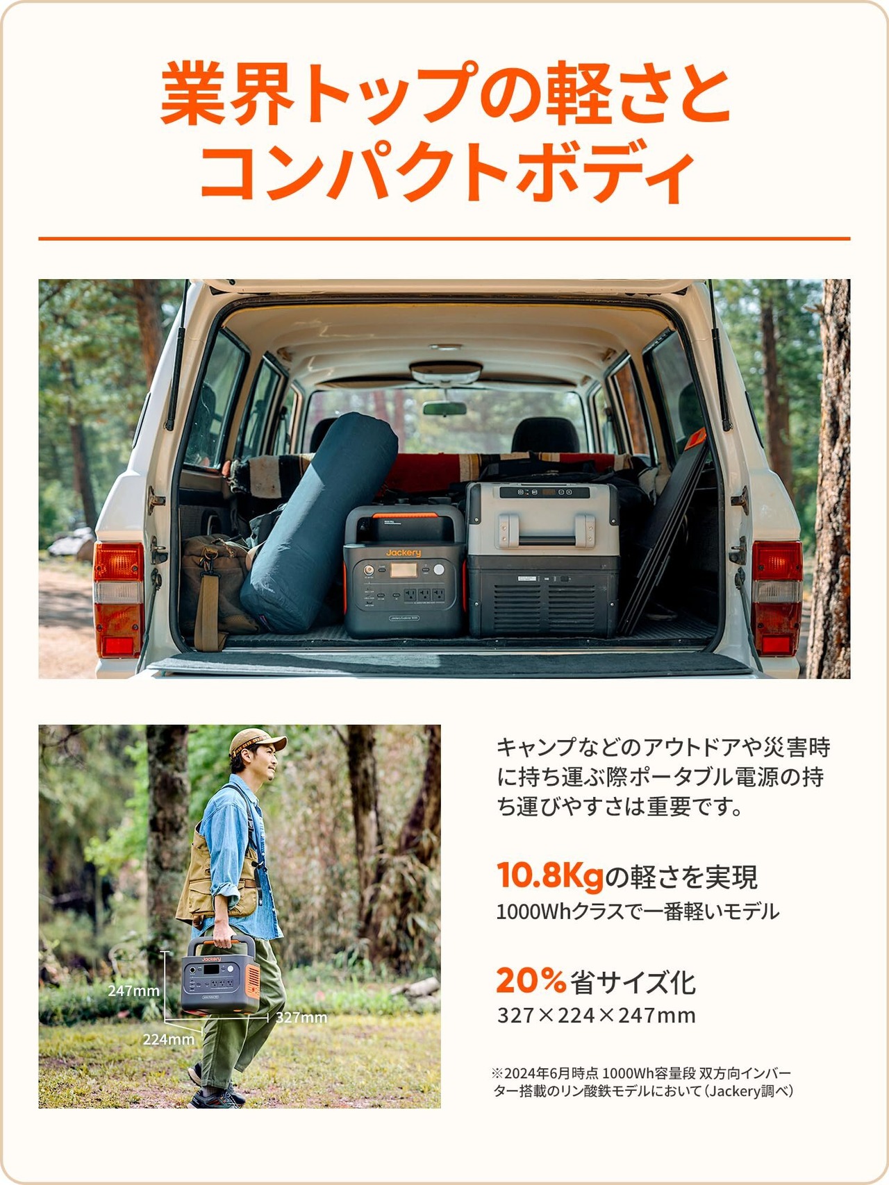 Jackery ポータブル電源 1000 New 1070Wh 業界トップの軽さとコンパクトボディ 1時間満充電 リン酸鉄 10年長寿命 定格出力1500W 瞬間最大3000W 防災 家庭用 アウトドア用 車中泊 UPS機能 アプリ遠隔操作 純正弦波 AC100V 50Hz/60Hz対応