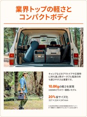 【業界トップの軽さとコンパクトボディ】約10.8kgのポータブル電源、製品設計の見直しをすることで全体の体積を20%削減しました。1000Wh~1500Wh容量段で一番軽いモデル。業界屈指のコンパクトさ:327*224*247mm。