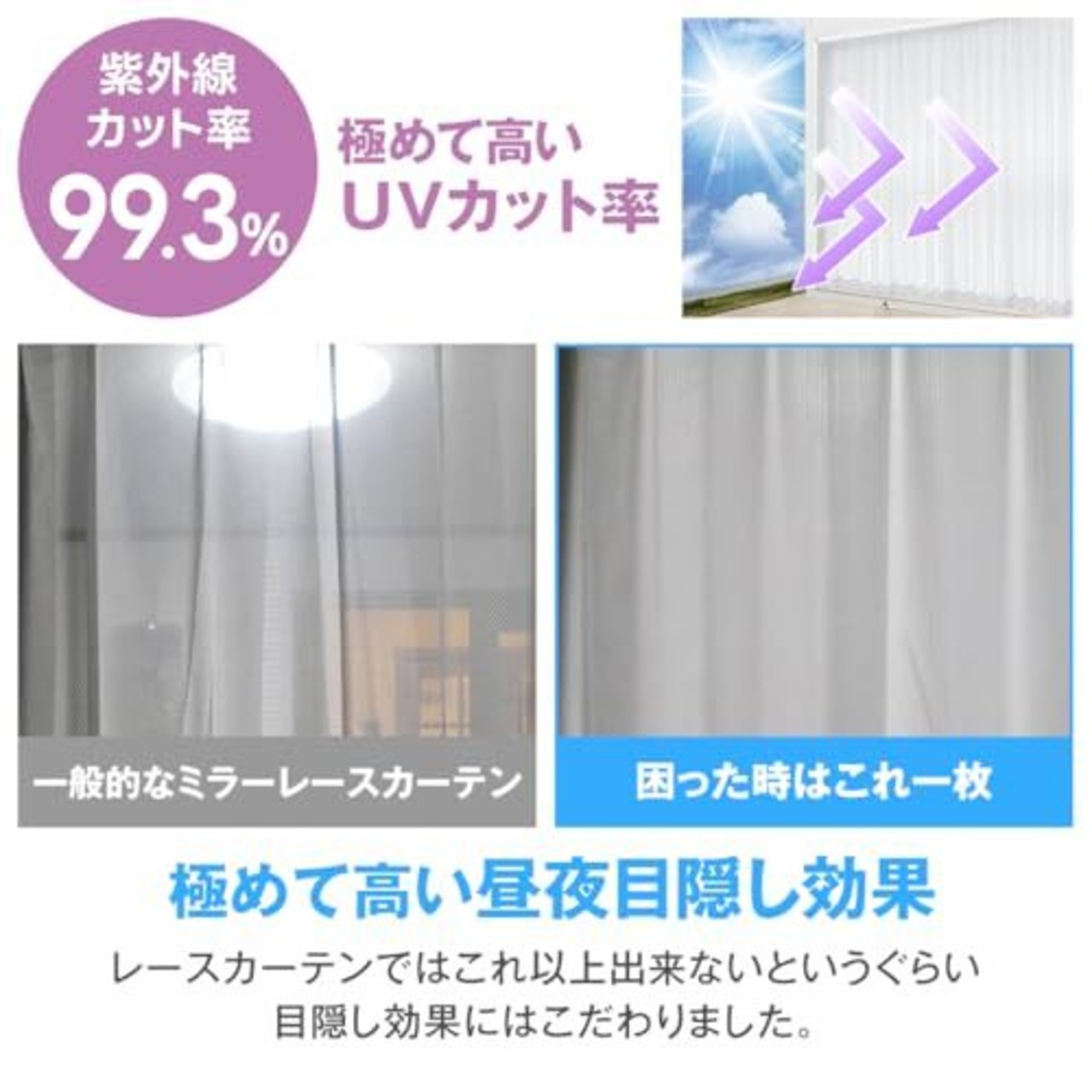 目隠し効果は、昼・夜ともに大丈夫!レースカーテンではこれ以上できないというぐらい目隠し効果にはこだわりました。また、裏に縫い付けてある生地によりミラーレース特有のギラギラとした質感がありません。断熱効果で、暑い時期の外からの熱線からお部屋を守って、冷房の効きが高まるので防暑・節電対策にも心強い!また、保温性が高いのでお昼間のカーテンを閉めない時または、カーテンがないお部屋でもこれ一枚で暖房効果が高まり、お部屋を暗くせず防寒対策ができる!