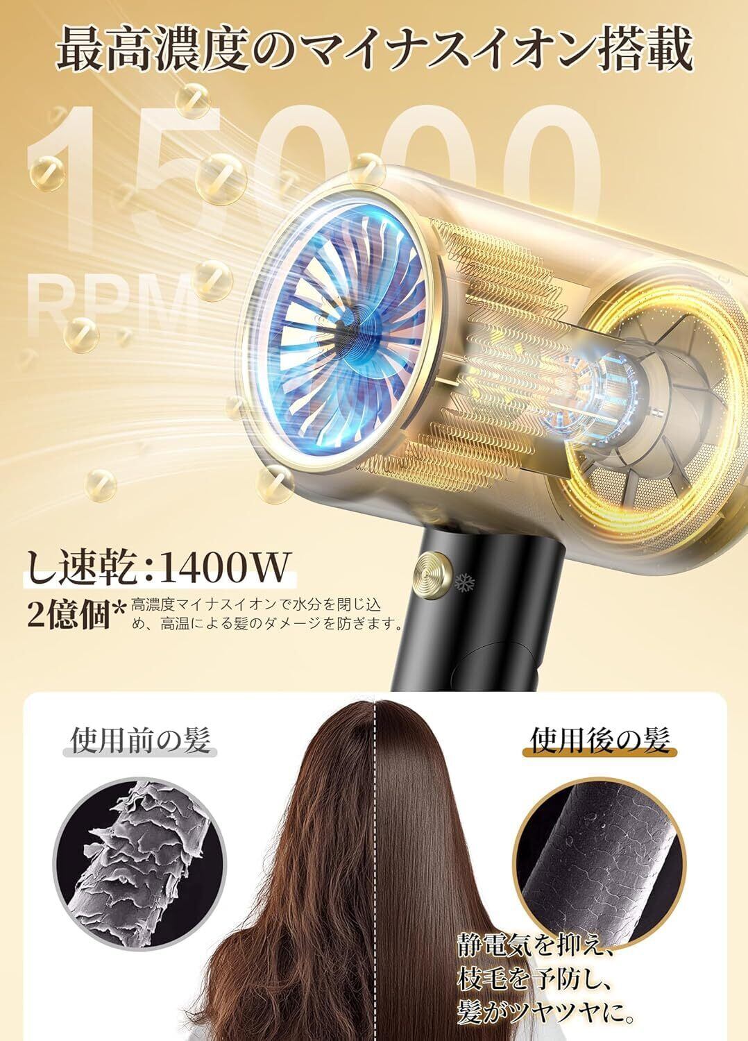 【髪質改善・マイナスイオン】あなたの髪を一日中サラサラで美しく保つ秘密が、このヘアドライヤーには内蔵されています。ヘアドライヤーは特許取得済みの高濃度ネガティブイオン技術を駆使し、毎回の使用で2000万個ものネガティブイオンを髪に送り込みます。これらのイオンは、髪に水分を閉じ込め、静電気を抑制し、髪の乾燥と切れ毛を防ぎます。長く使うと、髪をつややかにするだけでなく、髪の光沢感と柔らか感を向上させます。「早くて楽に、そして美しく髪を乾かしたい」というニーズを叶えたドライヤーです!