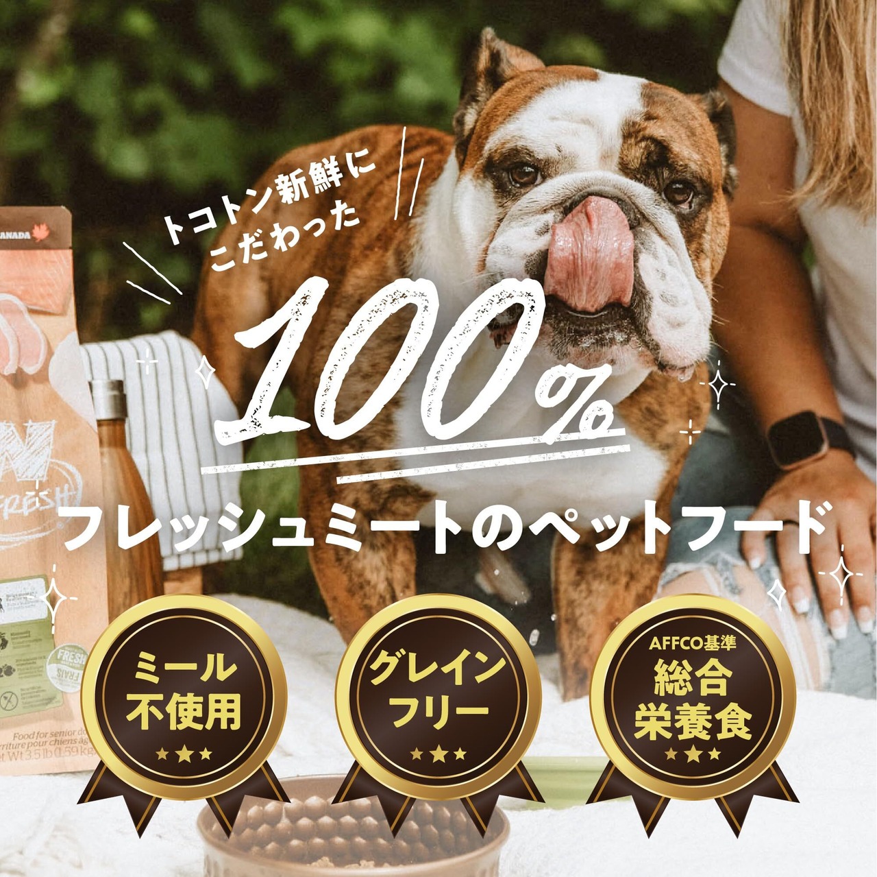 【100%フレッシュな生肉・鮮魚を使用】消化にやさしく美味しい、生(フレッシュ)の食材にとことんこだわり、乾燥肉やミートミールを使わない「100%」新鮮な生肉・鮮魚を使っています。