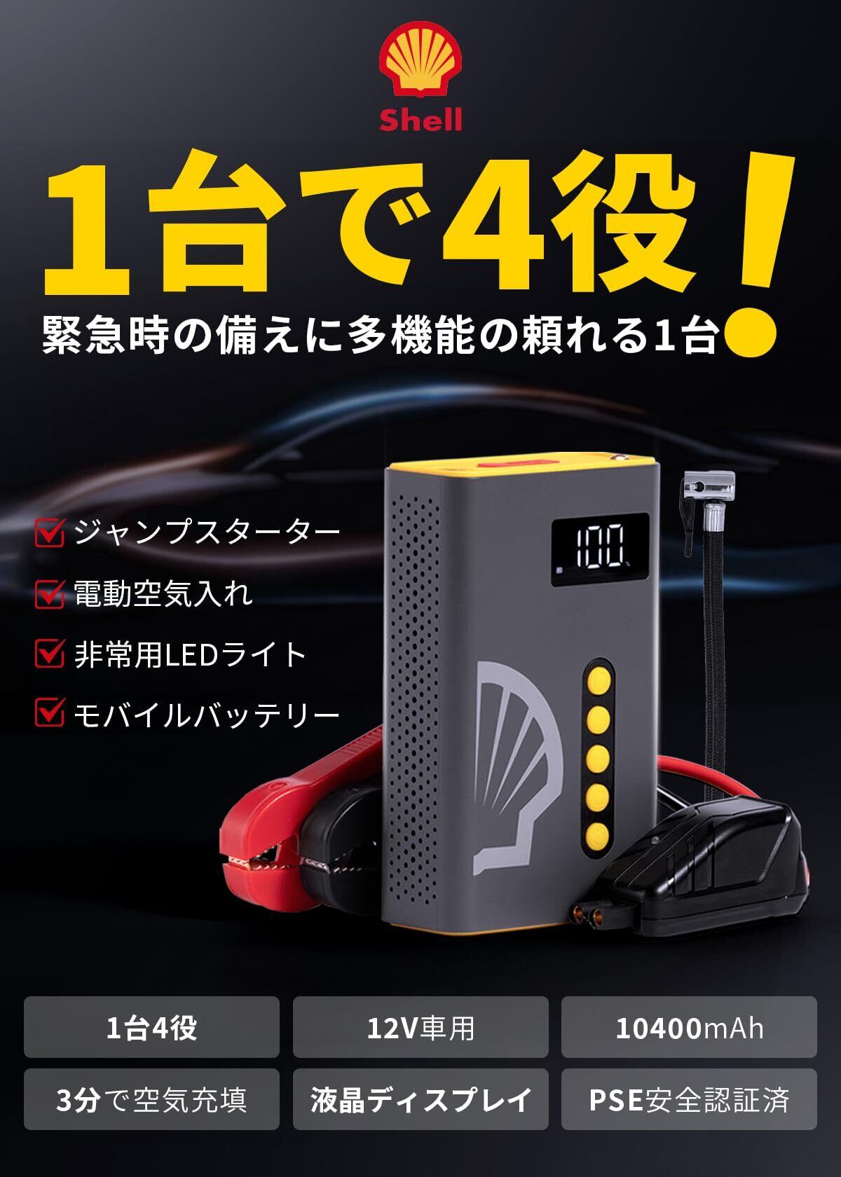 【特価商品】Shell シェル ジャンプスターター 空気入れ 10400mAh大容量 ピーク電流1000A エアコンプレッサー搭載 電動空気入れ エンジンスターター 車緊急始動 モバイルバッテリー LED緊急ライト搭載 安全保護機能 PSE認証済 日本語取扱説明書 SL-AC001JP | ニコニコSHOP