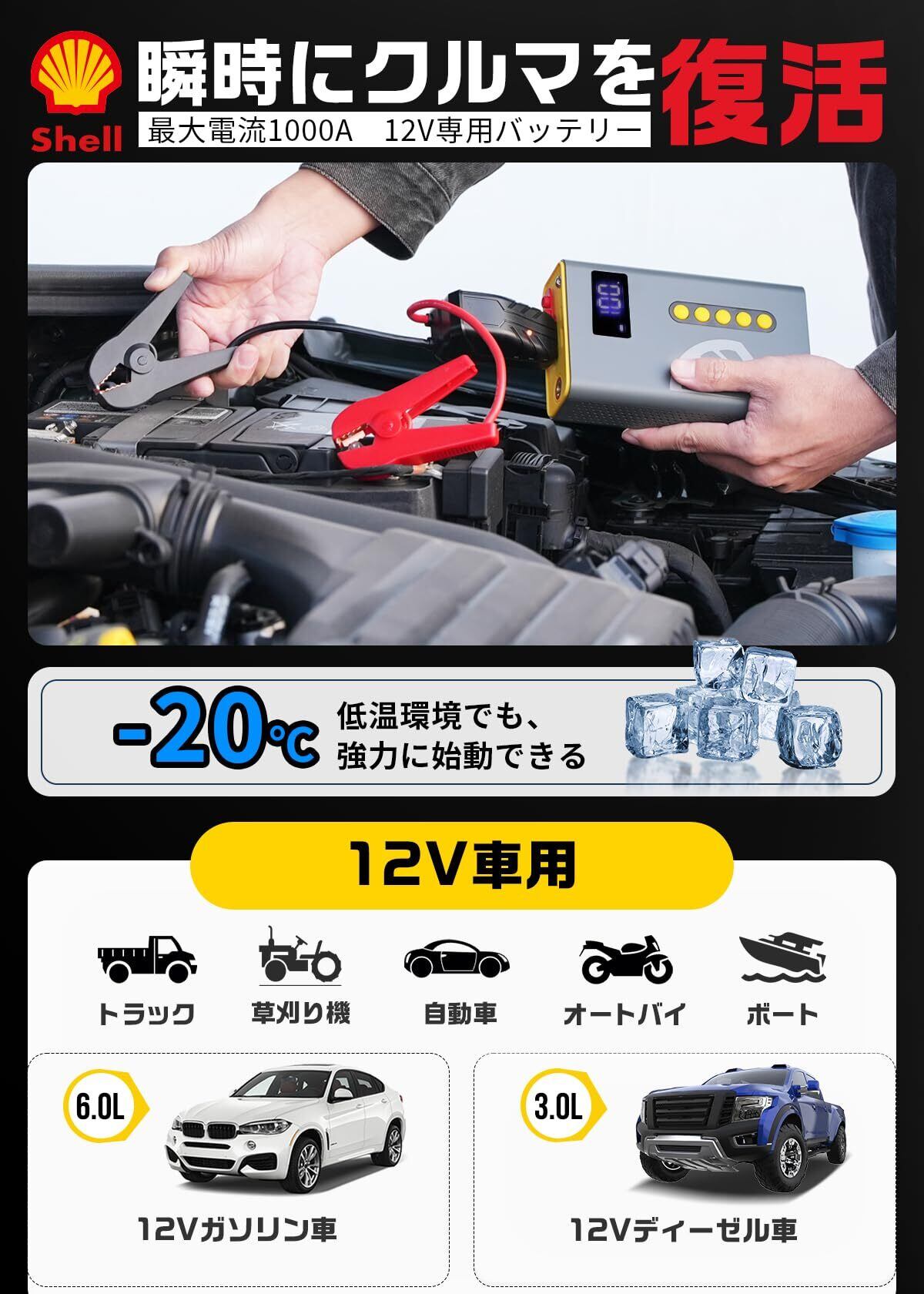 【瞬時に車を復活】12V大容量ジャンプスターターで、最大電流が1000Aに達して、6Lガソリン車と3Lディーゼル車に対応します。JAFのお呼び不要、車のバッテリーに簡単に接続だけで、寒い冬でも車を一発でかかります。10400mAh大容量で、急速充電にも対応できます。
