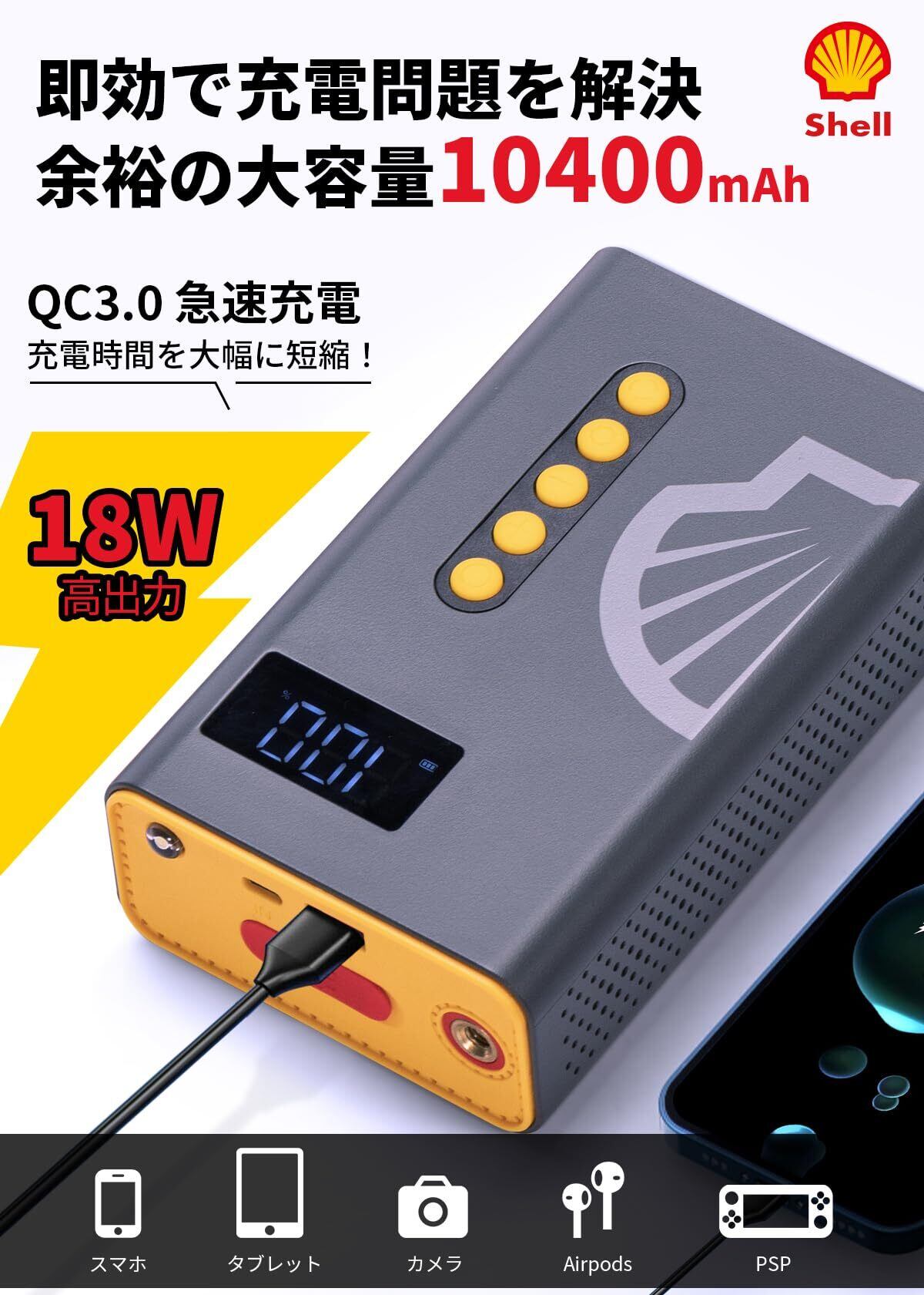 Shell シェル ジャンプスターター 空気入れ 10400mAh大容量 ピーク電流1000A エアコンプレッサー搭載 電動空気入れ エンジンスターター 車緊急始動 モバイルバッテリー LED緊急ライト搭載 安全保護機能 PSE認証済 日本語取扱説明書 SL-AC001JP