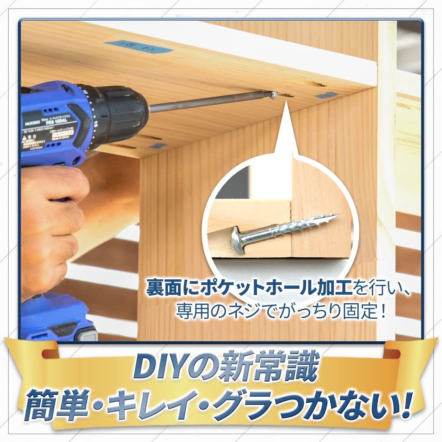 ポケットホールジョイントを使えば、ダボ等を使ったジョイントに比べて木材を非常に簡単に強固に接合できるため、DIYでの棚や机の作成でもグラつかずに組み立てが出来ます。