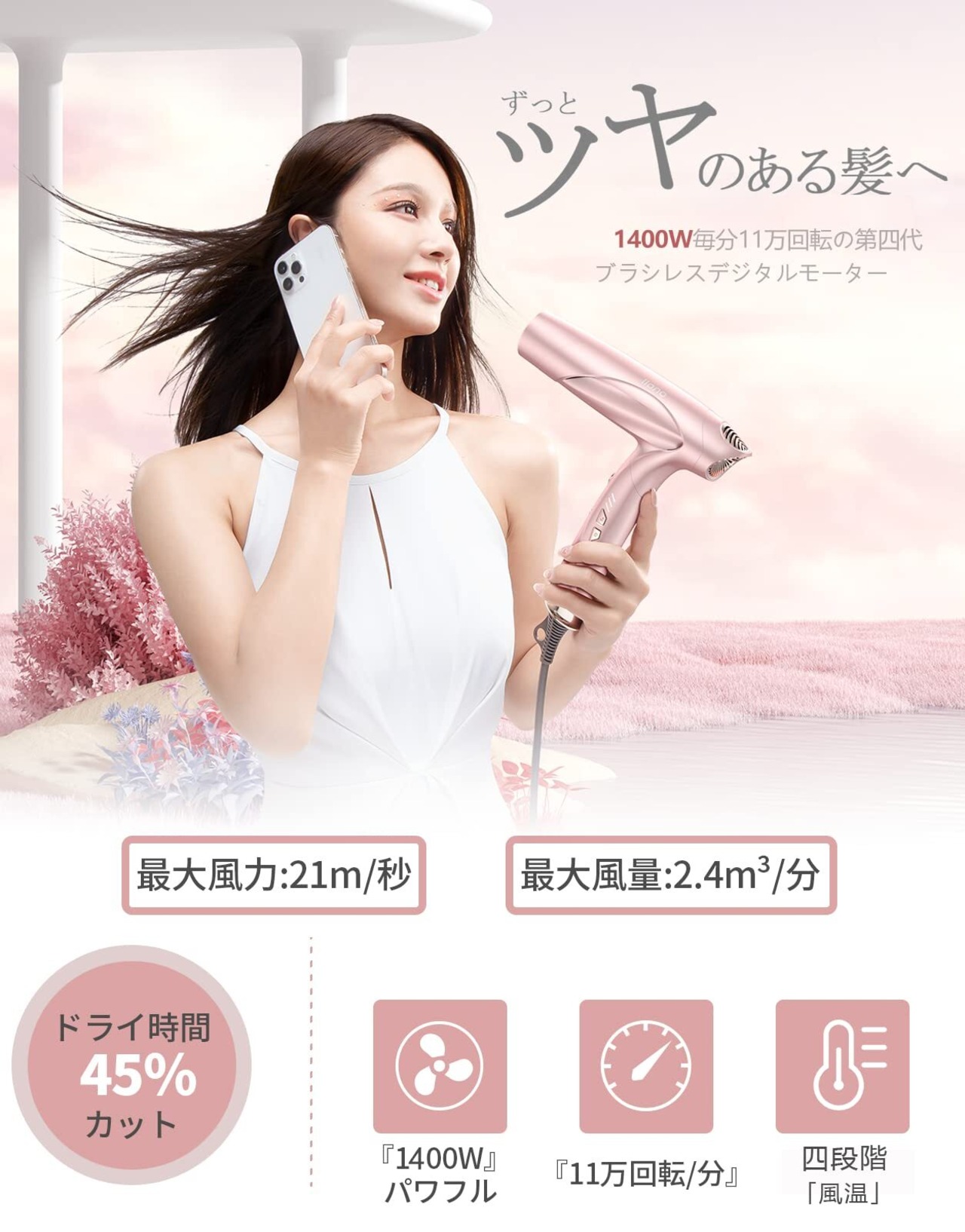 ◉【21メートル/秒圧倒的な高風速で、ドライ時間45%短縮】-- llanoプロ用 ヘアドライヤーは、1400W毎分11万回転の第四代ブラシレスデジタルモーターにより、空気流路に導入された周りの空気を圧縮して23m/sの風速で吹き出します。非速乾タイプに比べて、高速ダイナミック風の速乾タイプでは髪の表面温度が低くても、乾かす時間を45%短縮を実現し、濡れた髪を乾かしなからスタイリングするので過度な熱ダメージを防ぎます。冷風の時でも爆風なので、夏の暑い時期には大助かりです。忙しい女性に嬉しい時短にも繋がり、自宅がサロンに変わります。(!!!注意:1.電圧AC100V 50/60Hz 海外で使用不可 2.櫛を含まない)